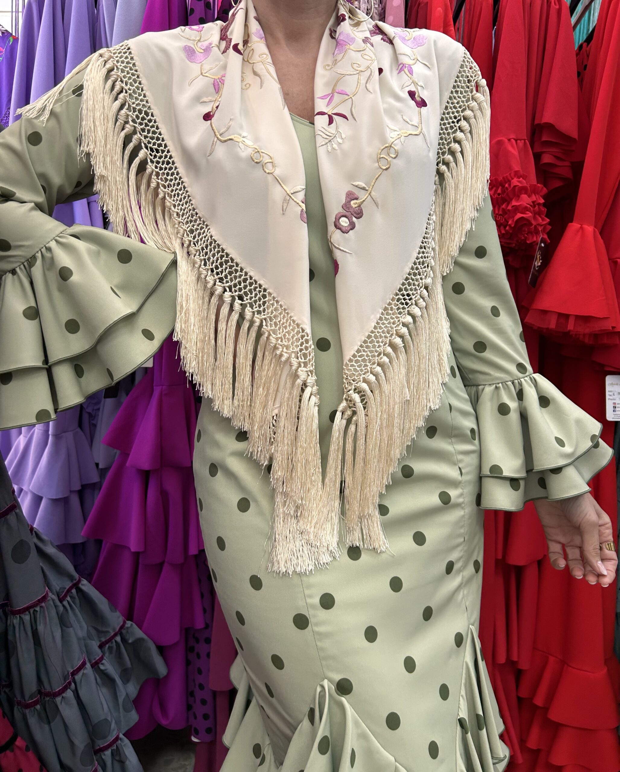 - Mantoncillo Bordado en Seda y Flecado en Seda en tejido de Crespón .