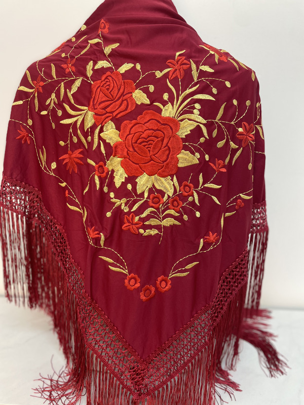 - Mantón en color Burdeos, bordados con Rosas en color Rojo y Dorado.