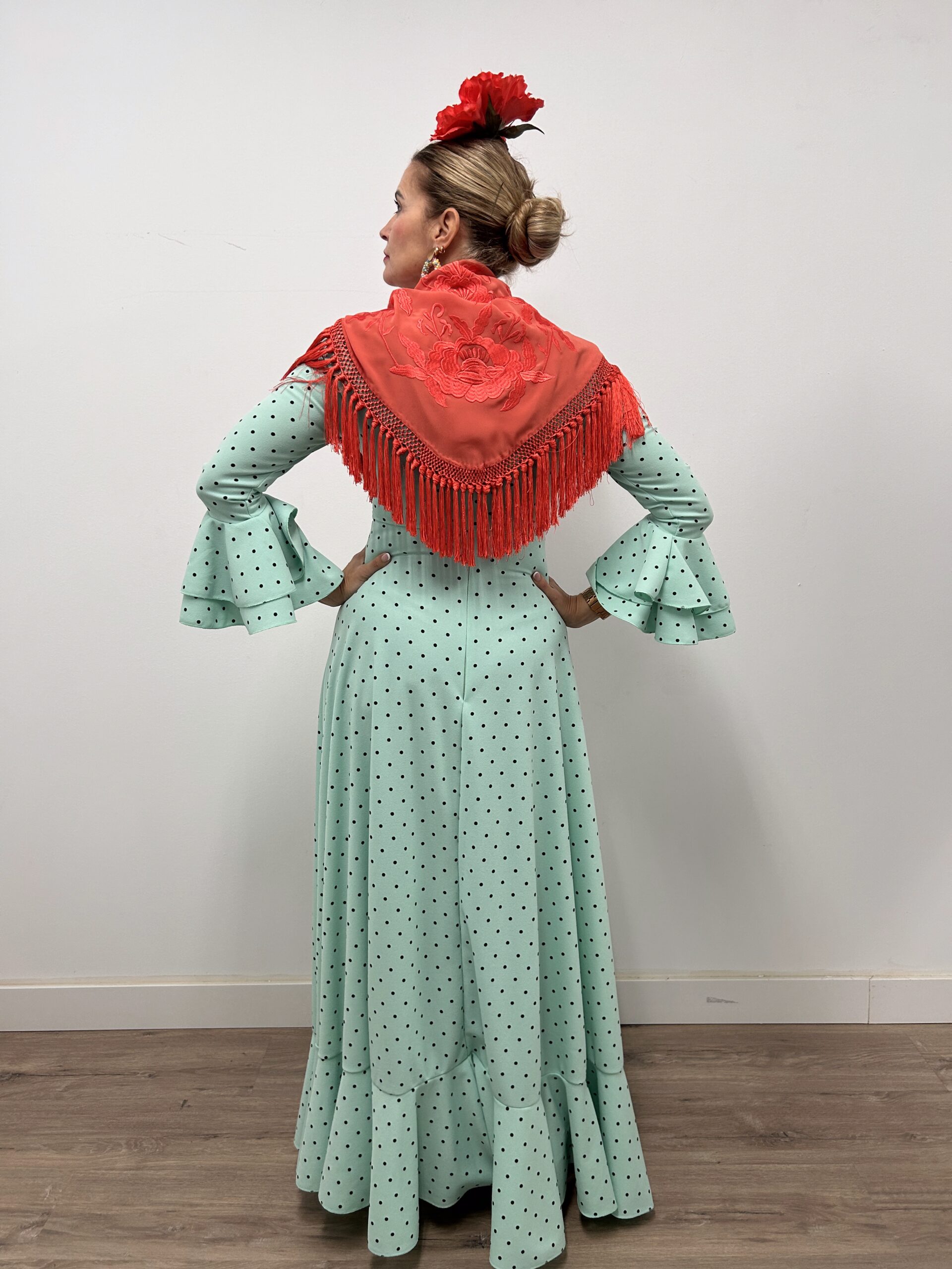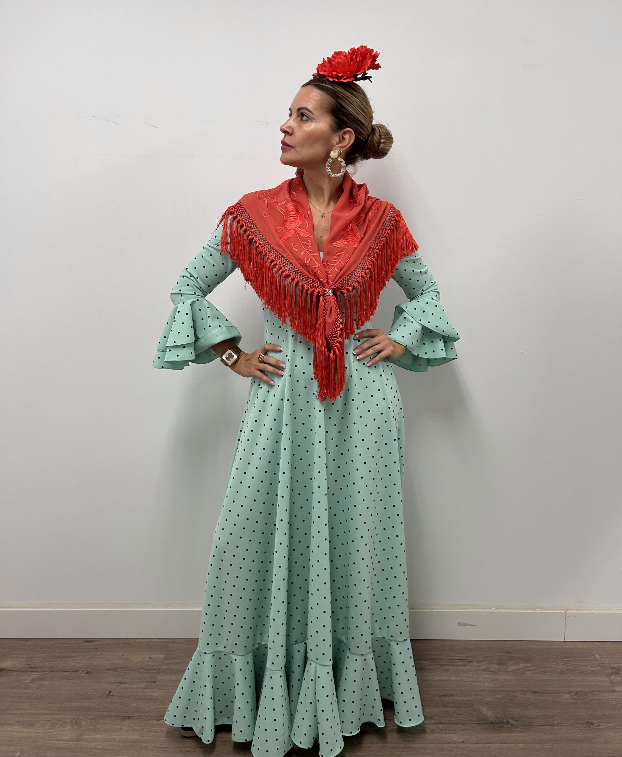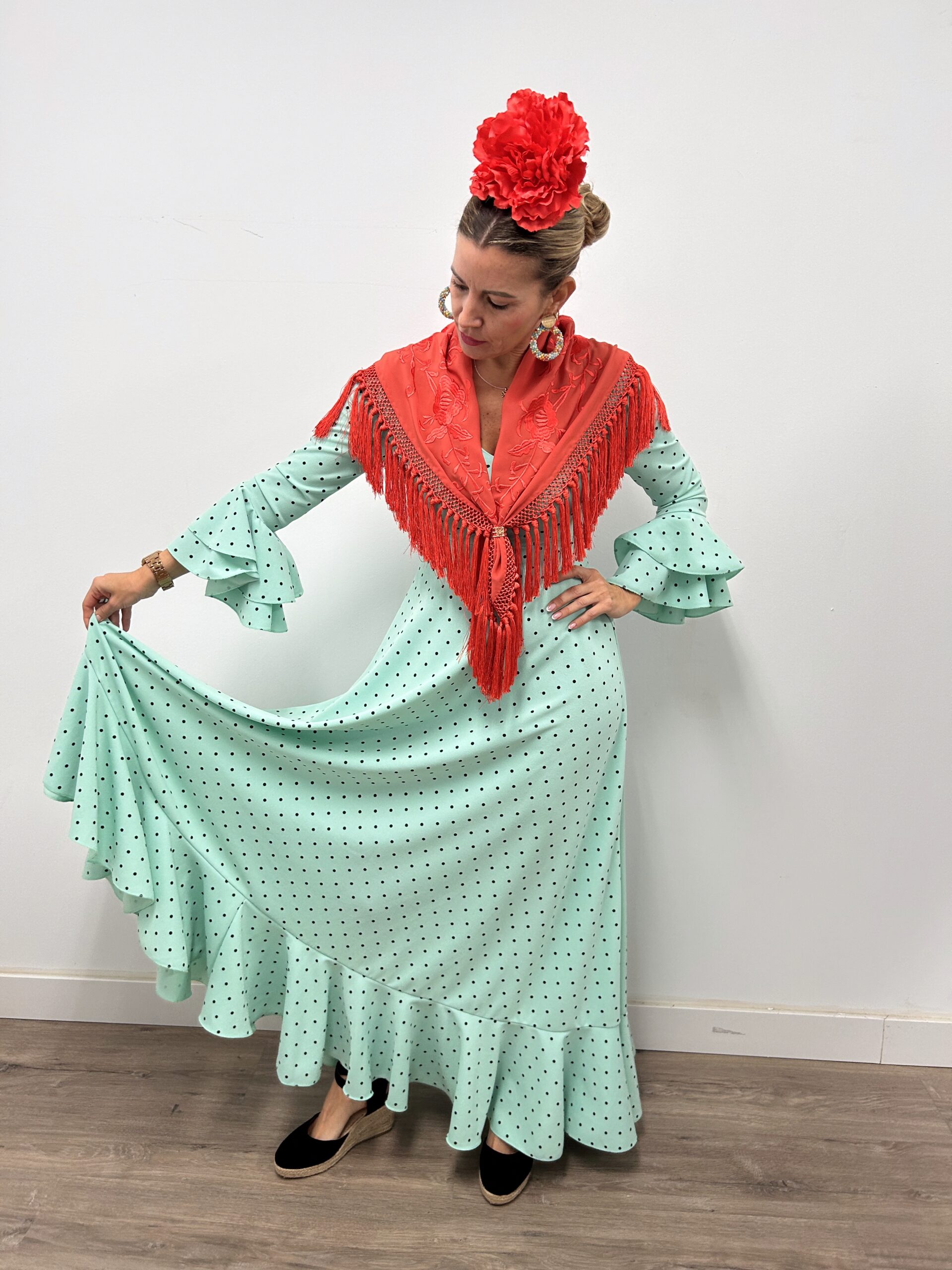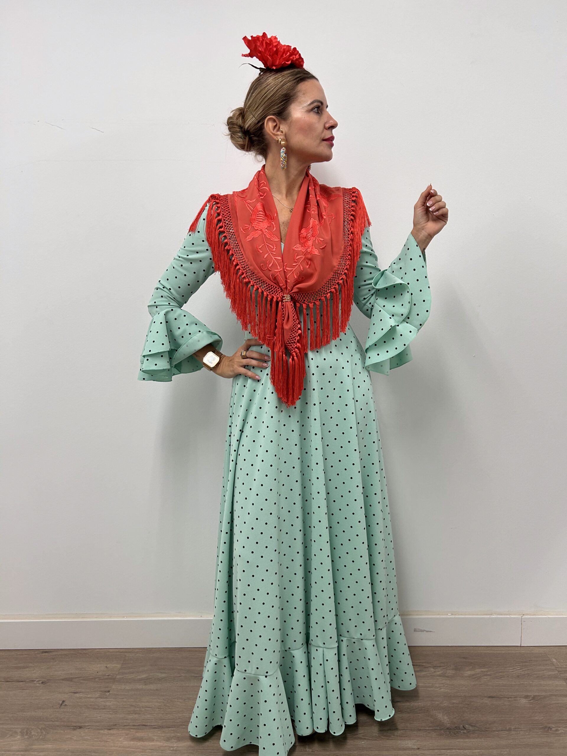 - Bata ideal para Romerías y camino, tejido de crepe elástico, manga larga ,falda amplia y cómoda.