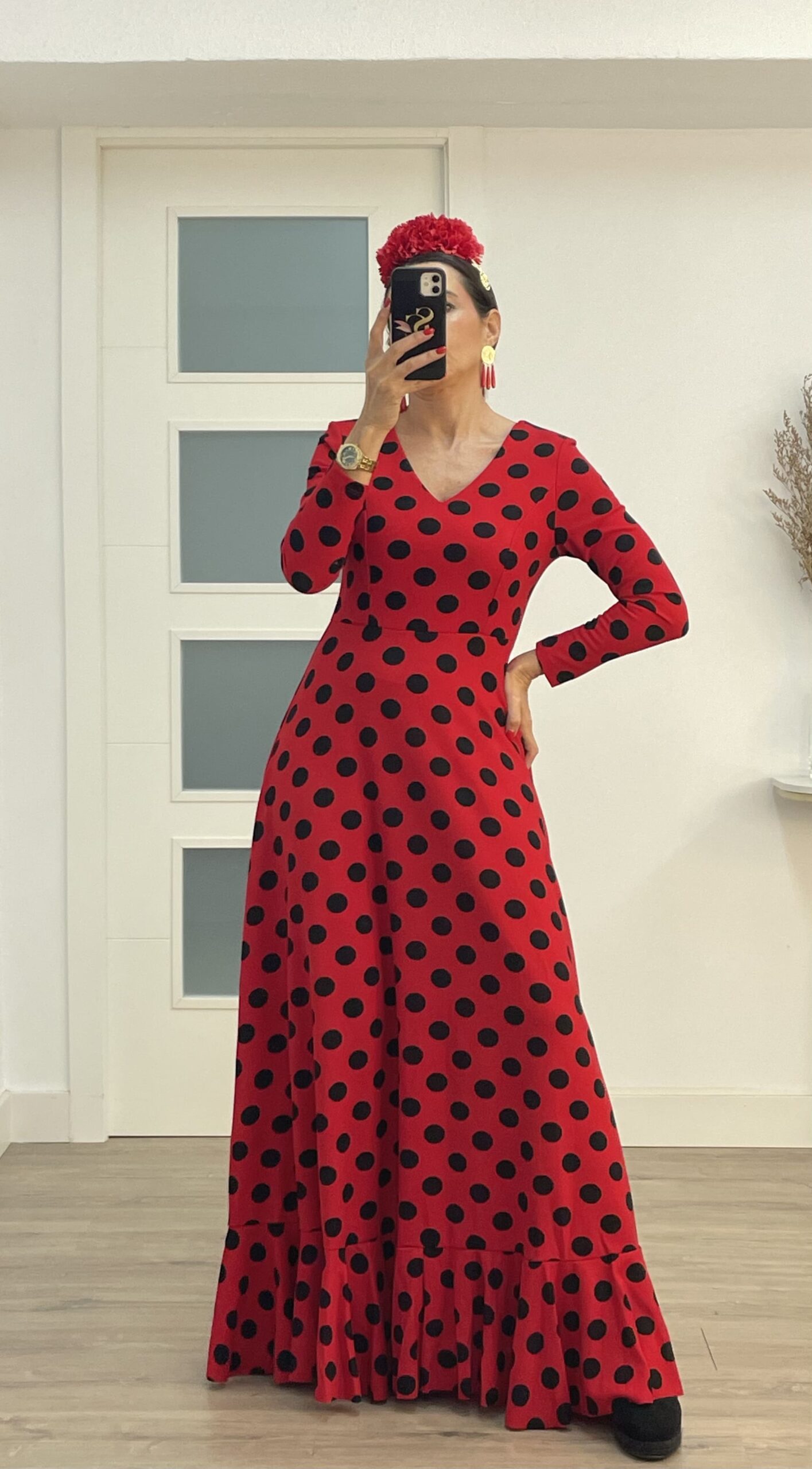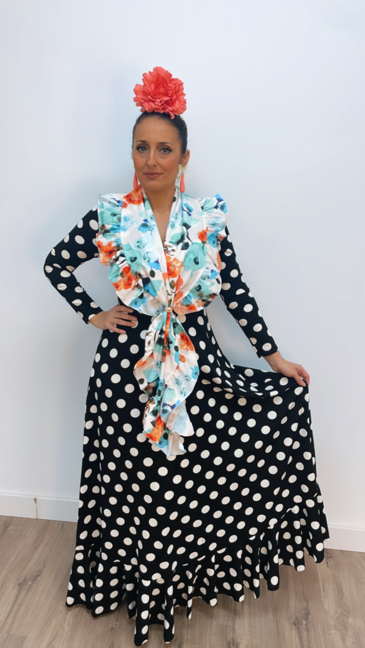 - Tejido de crepé elástico ,con un solo volante, manga larga, cremallera invisible, escote de pico por delante y por detrás.