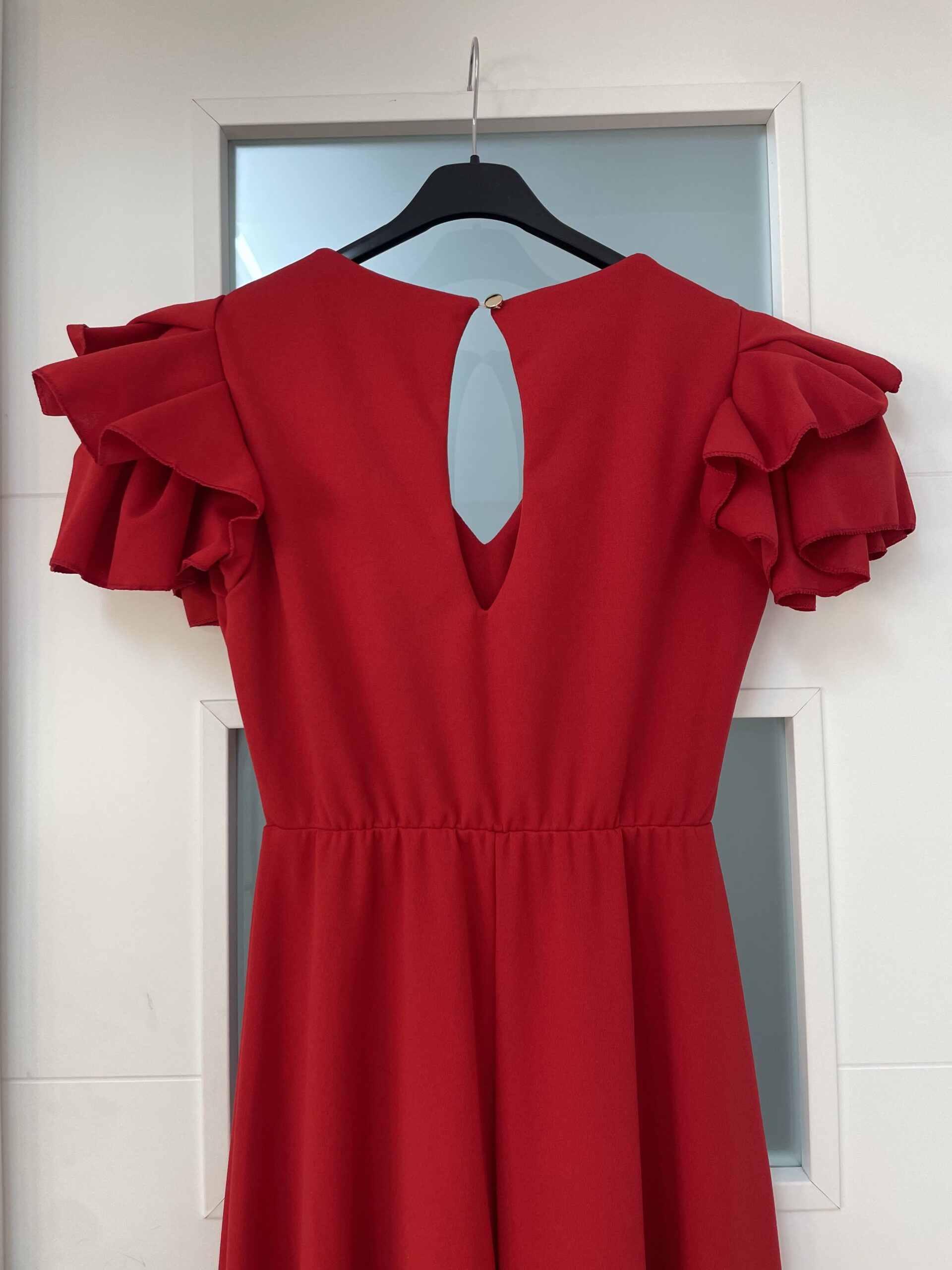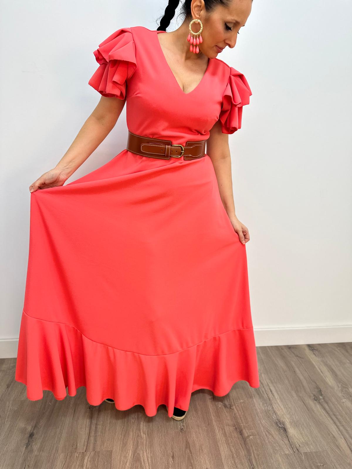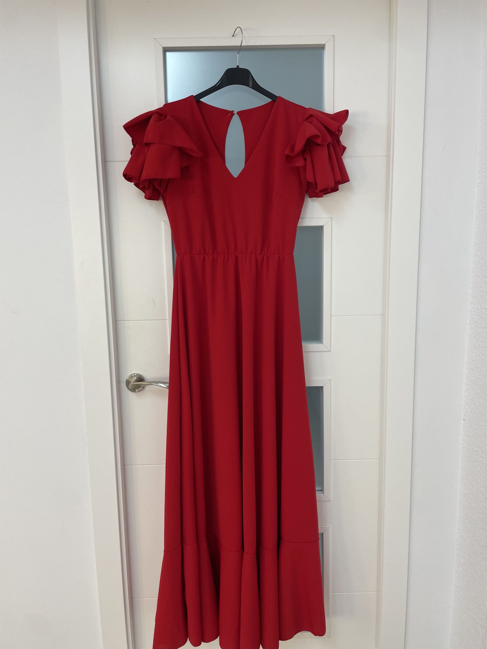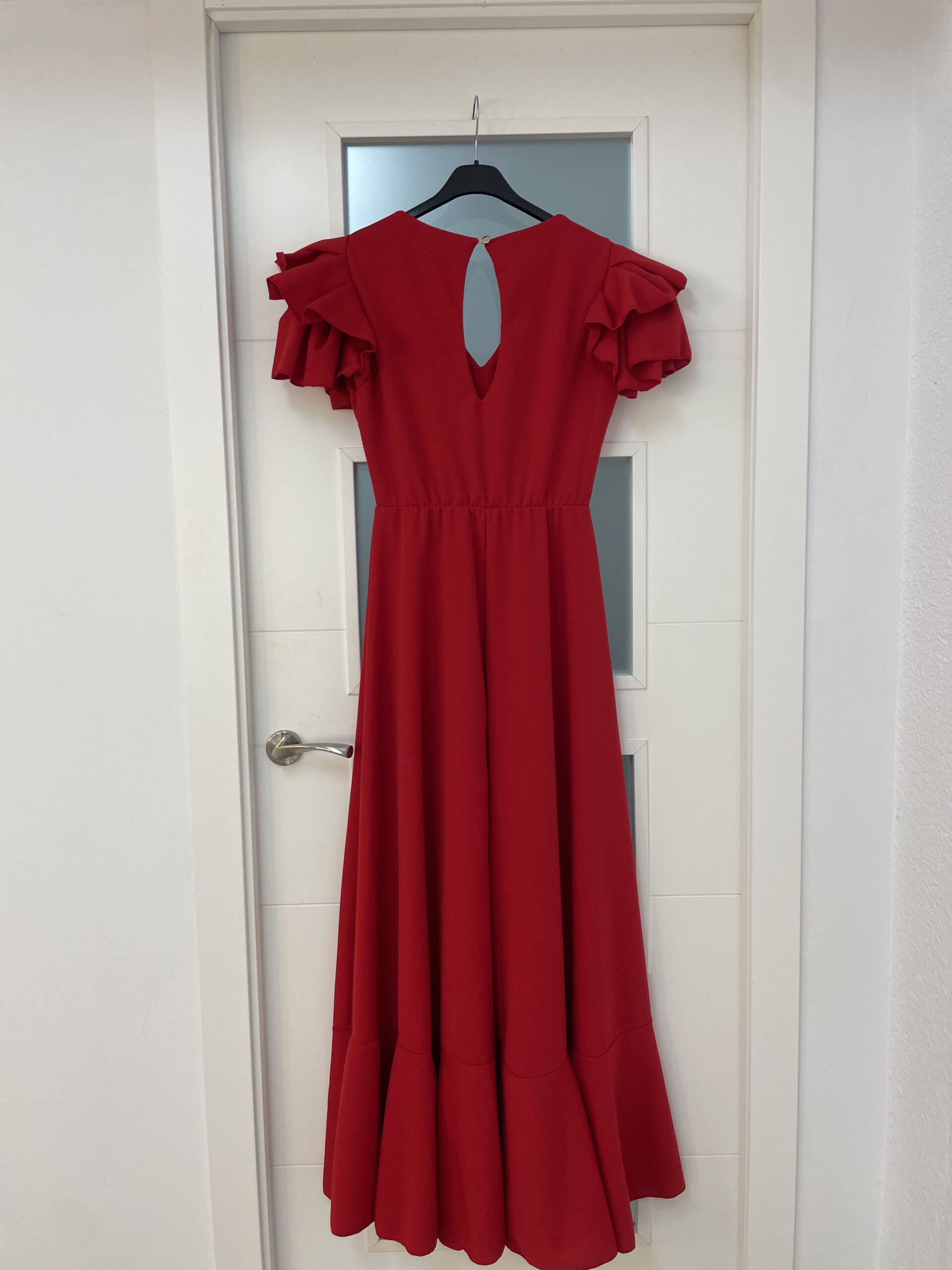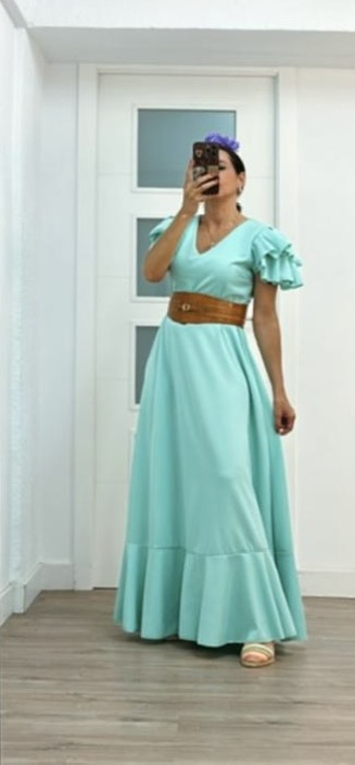 - Bata en tejido de Crepé elástico ,corte en la cintura y un solo volante ,espalda descubierta con cierre de botón dorado
