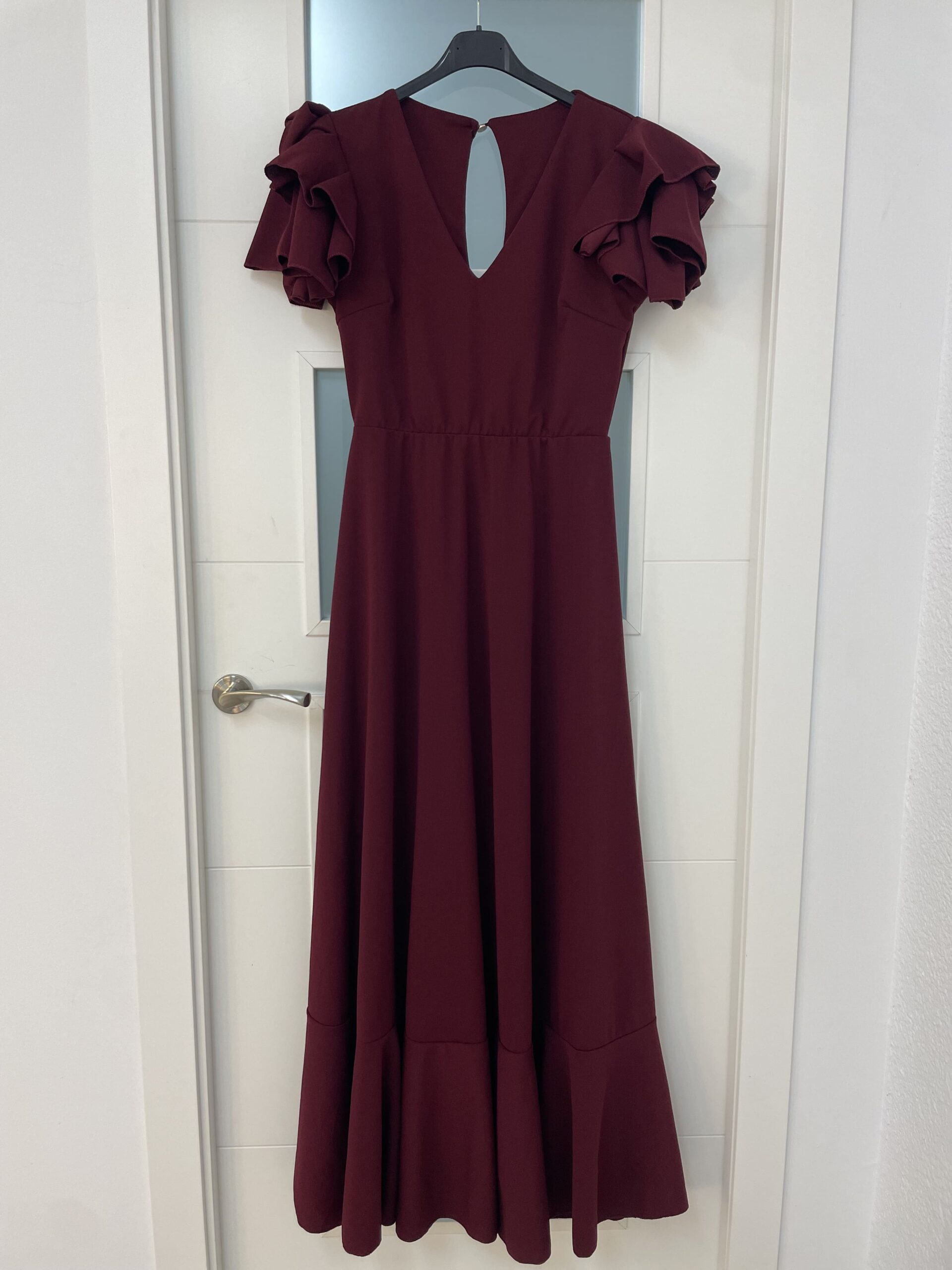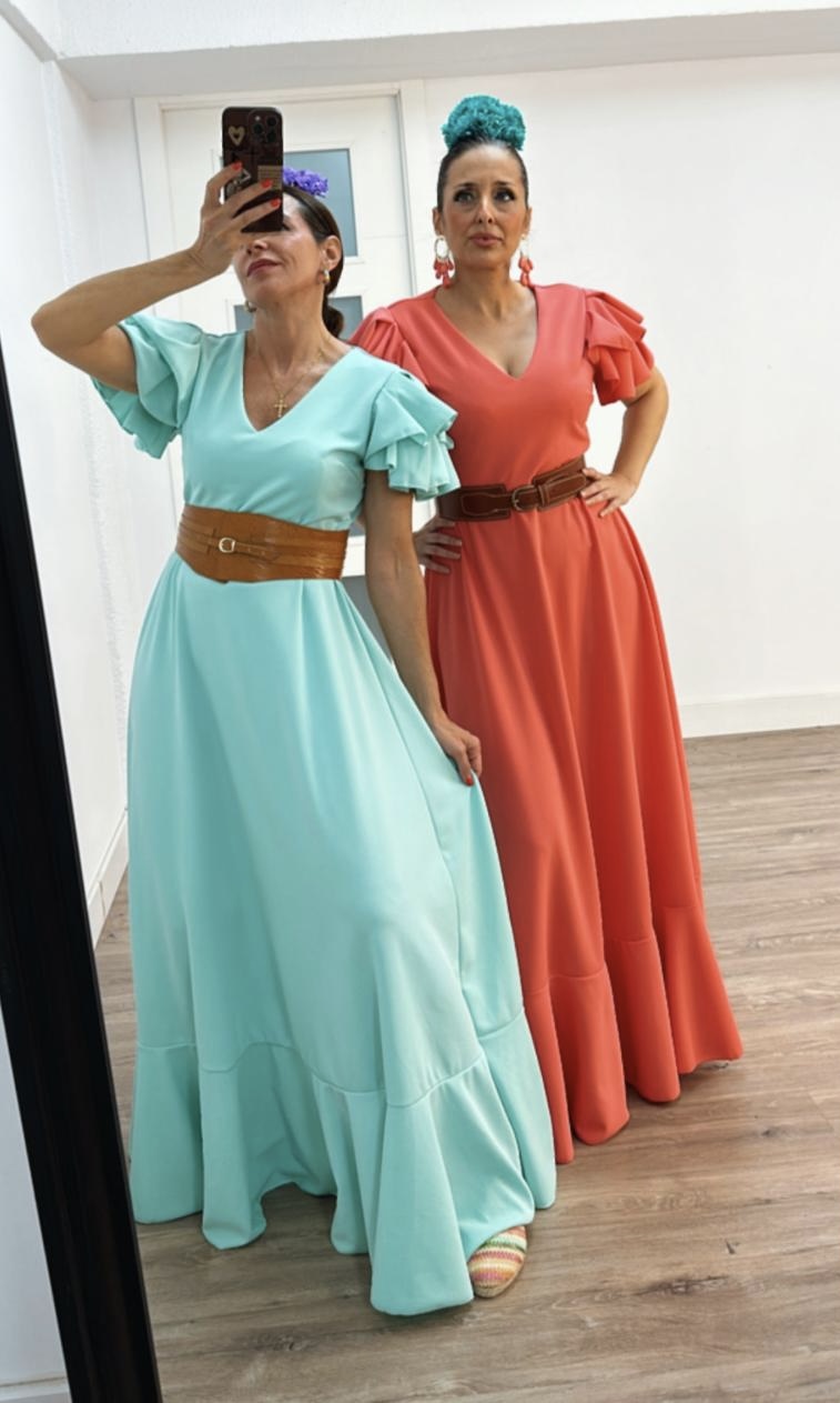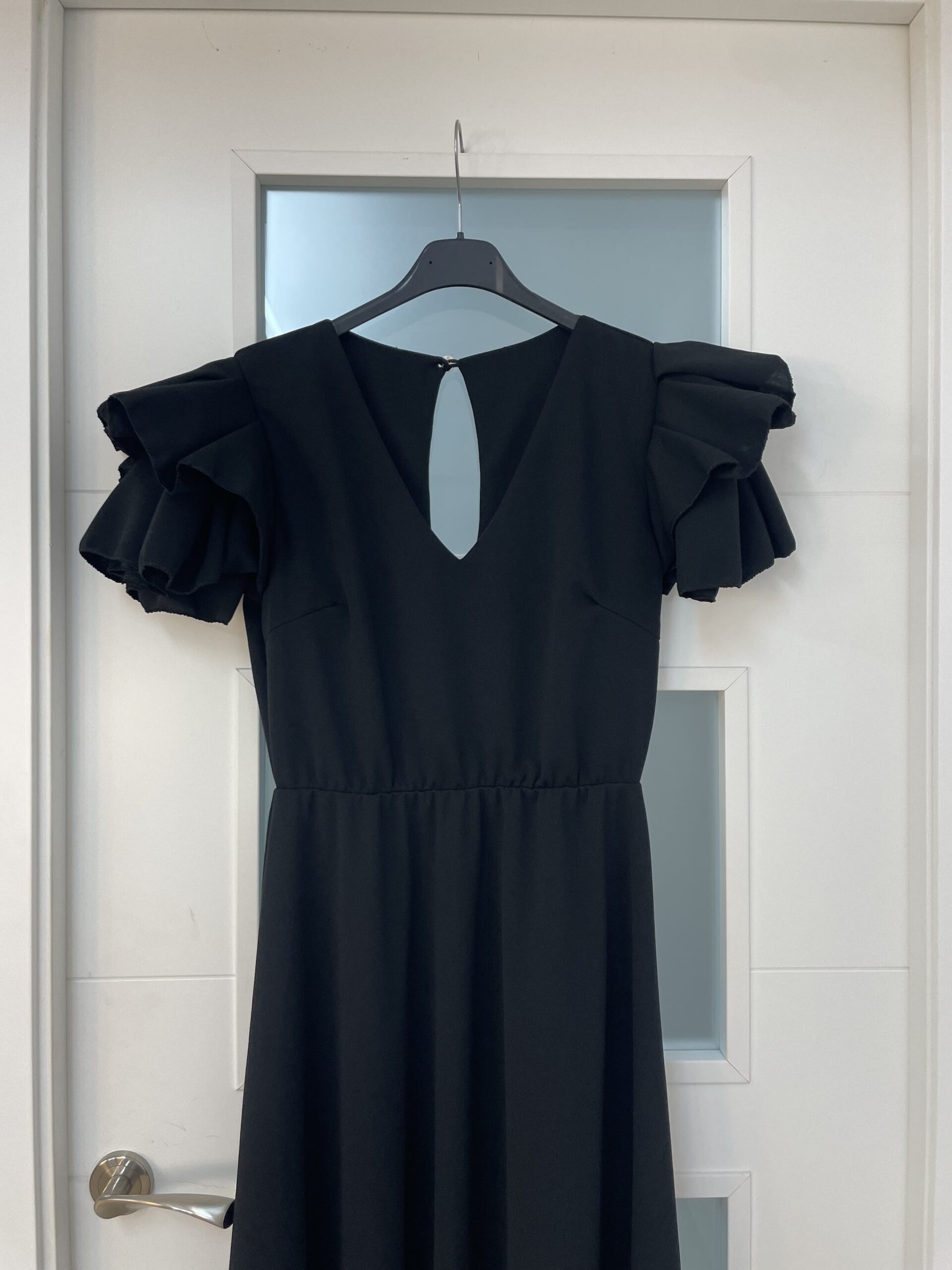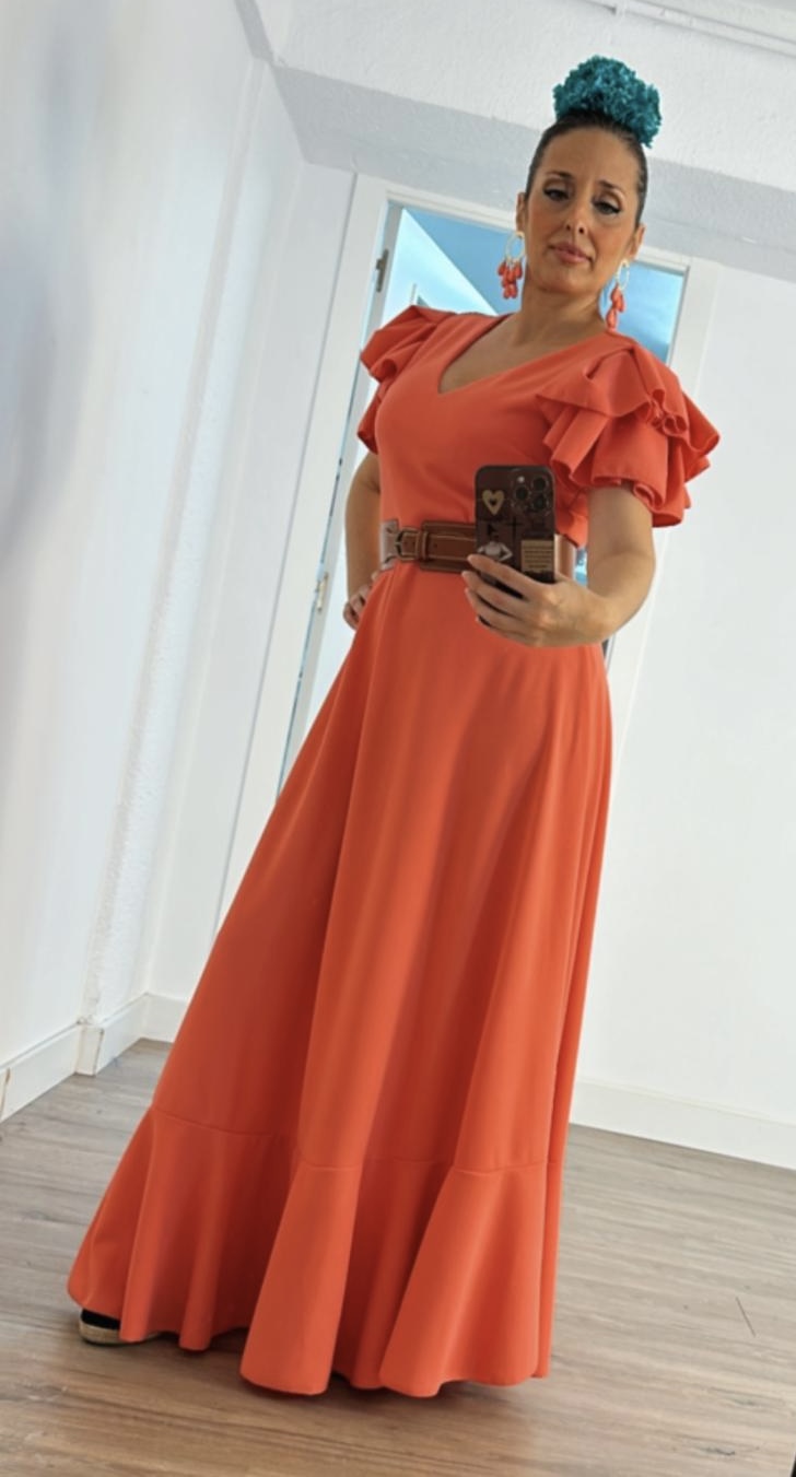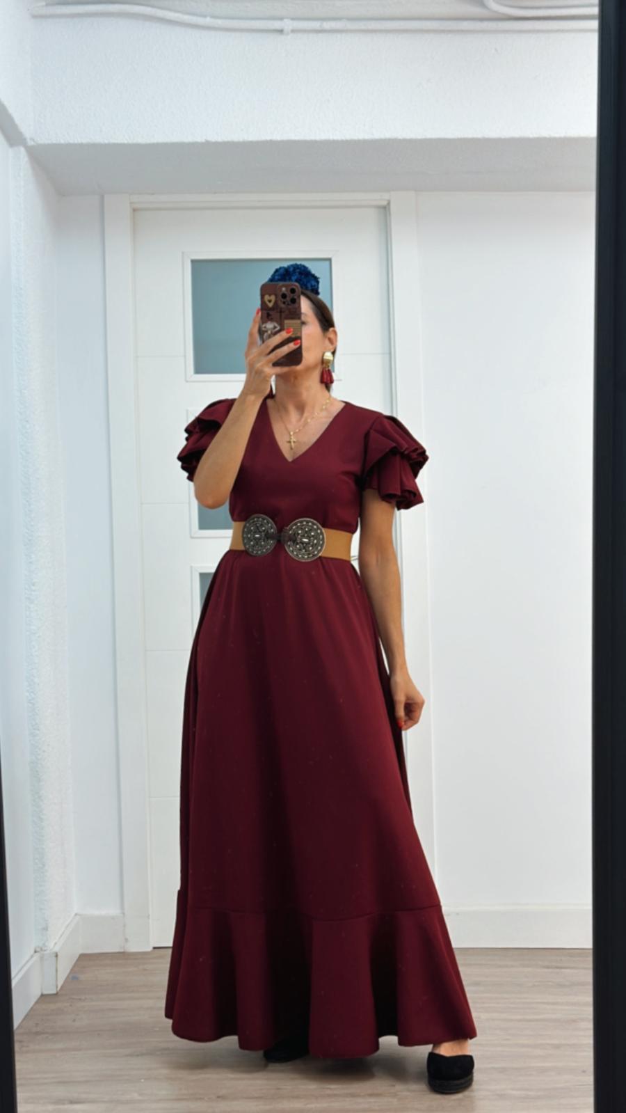 - Bata en tejido de Crepé elástico ,corte en la cintura y un solo volante ,espalda descubierta con cierre de botón dorado