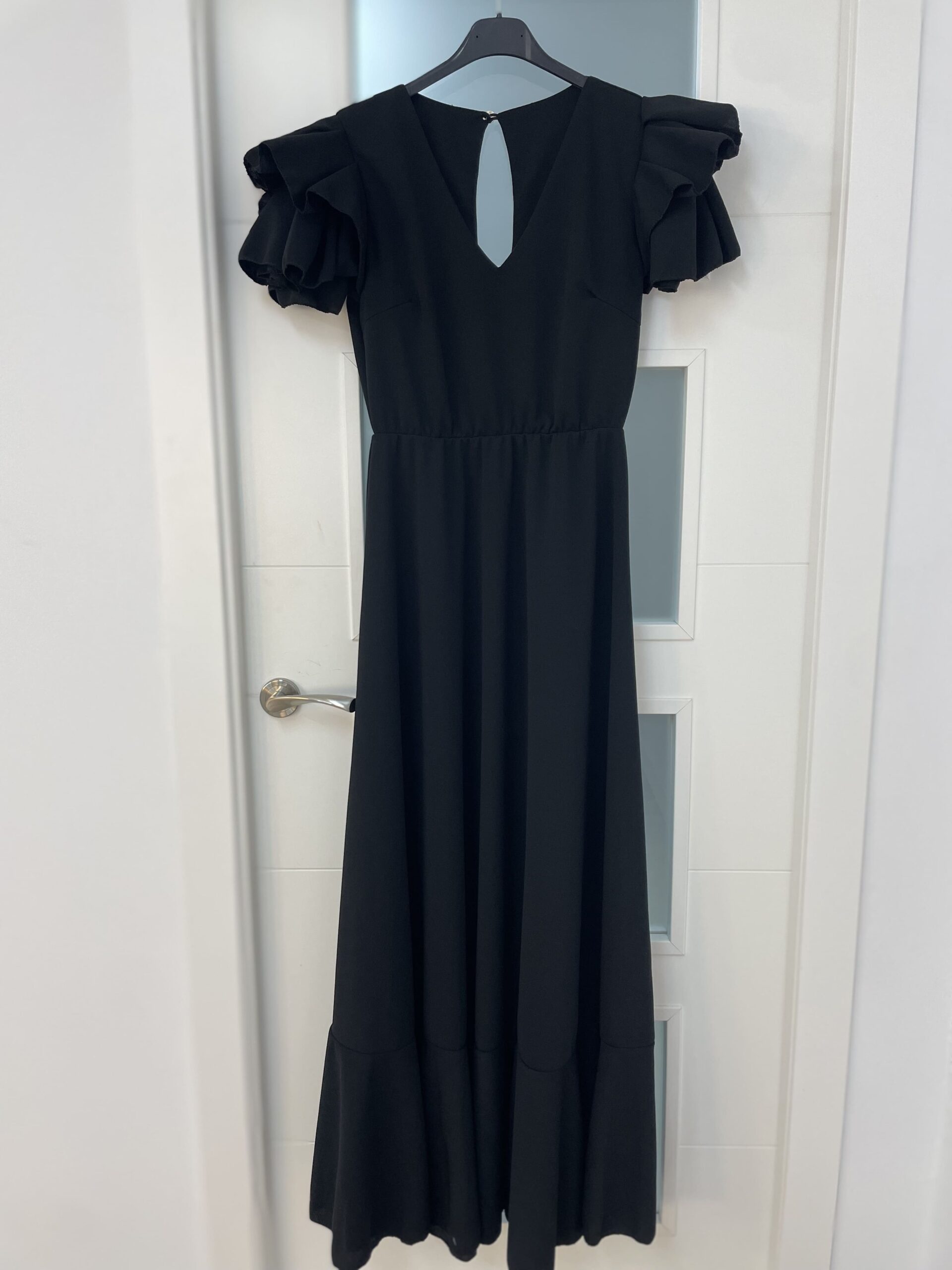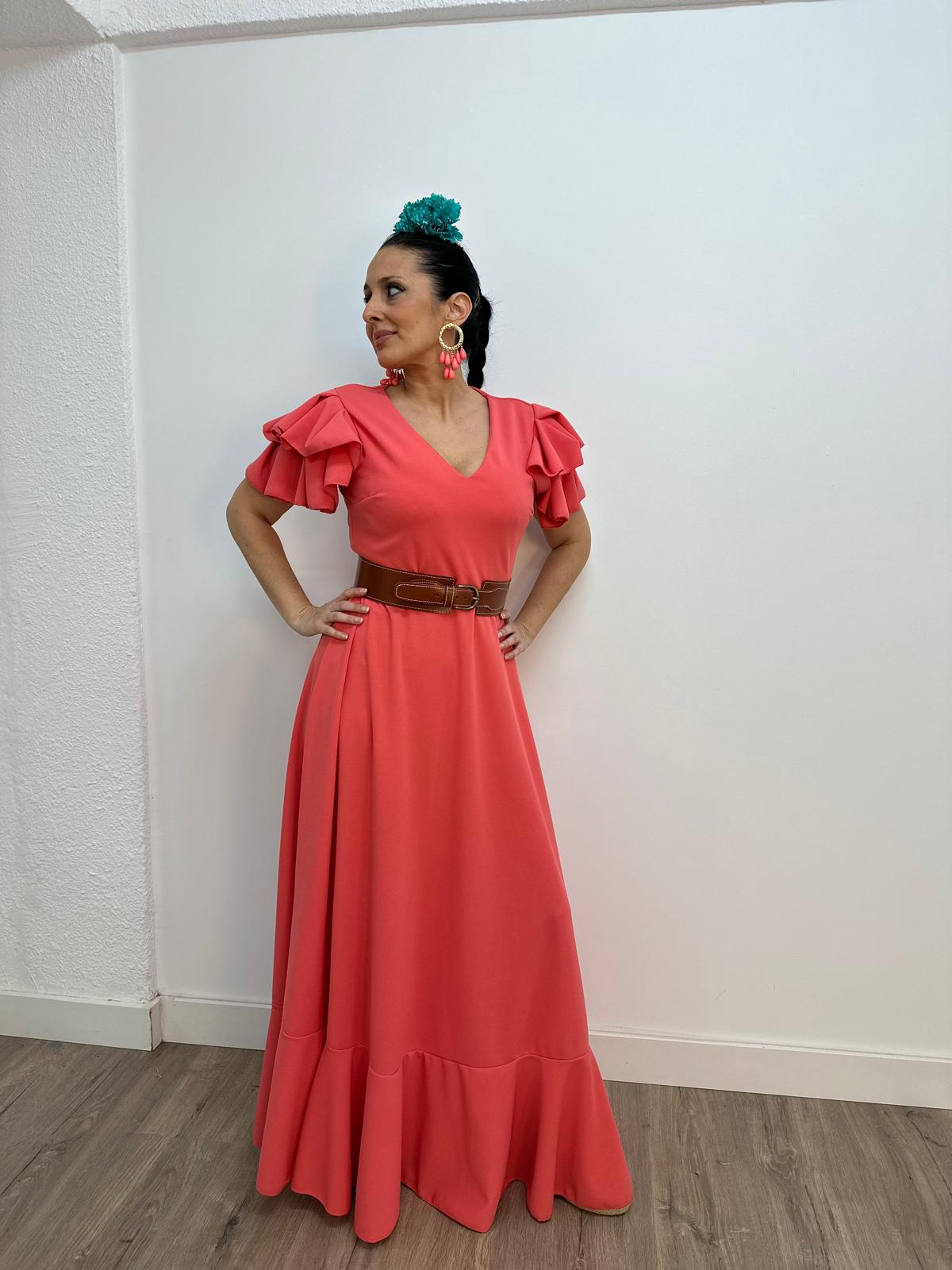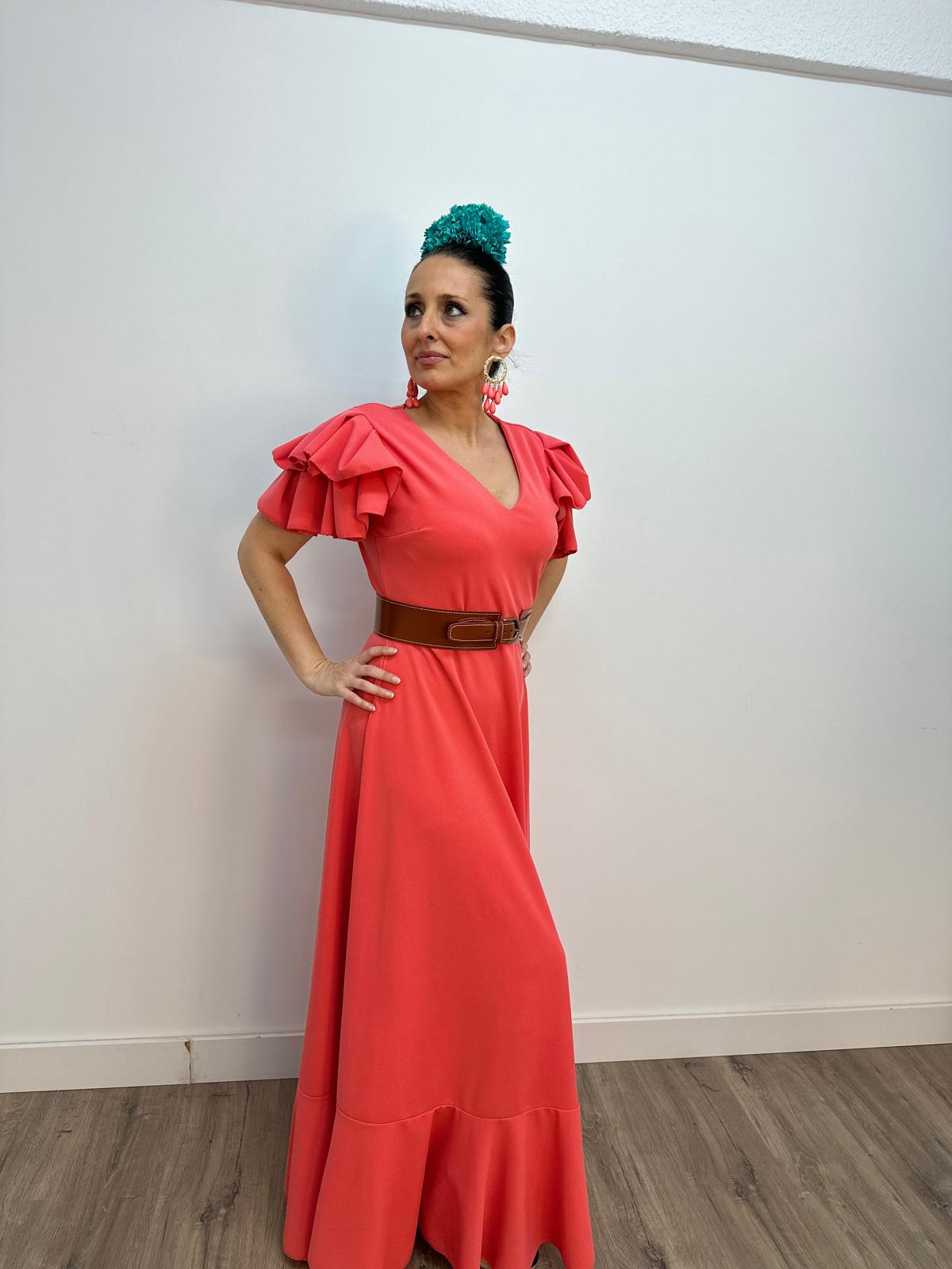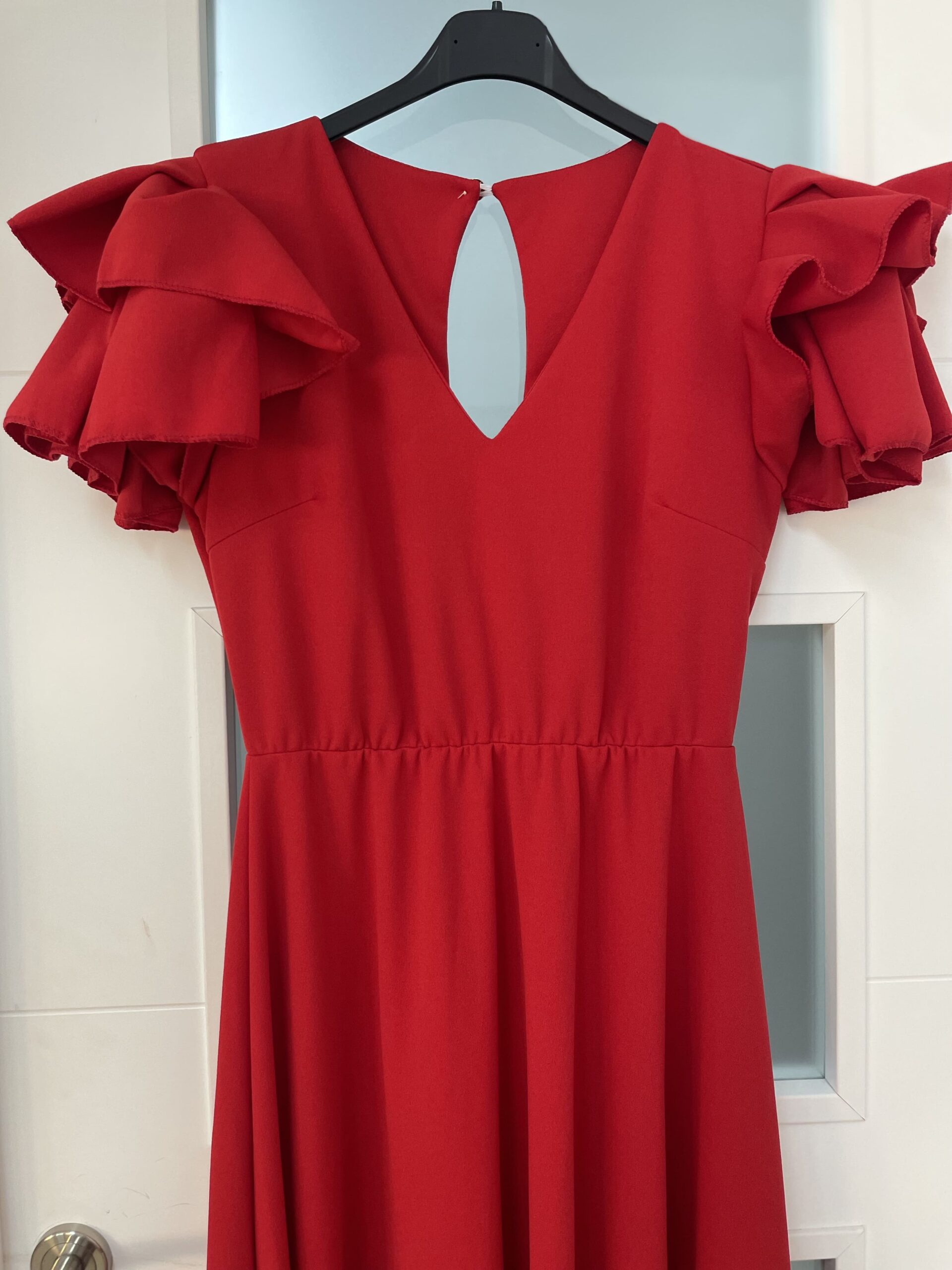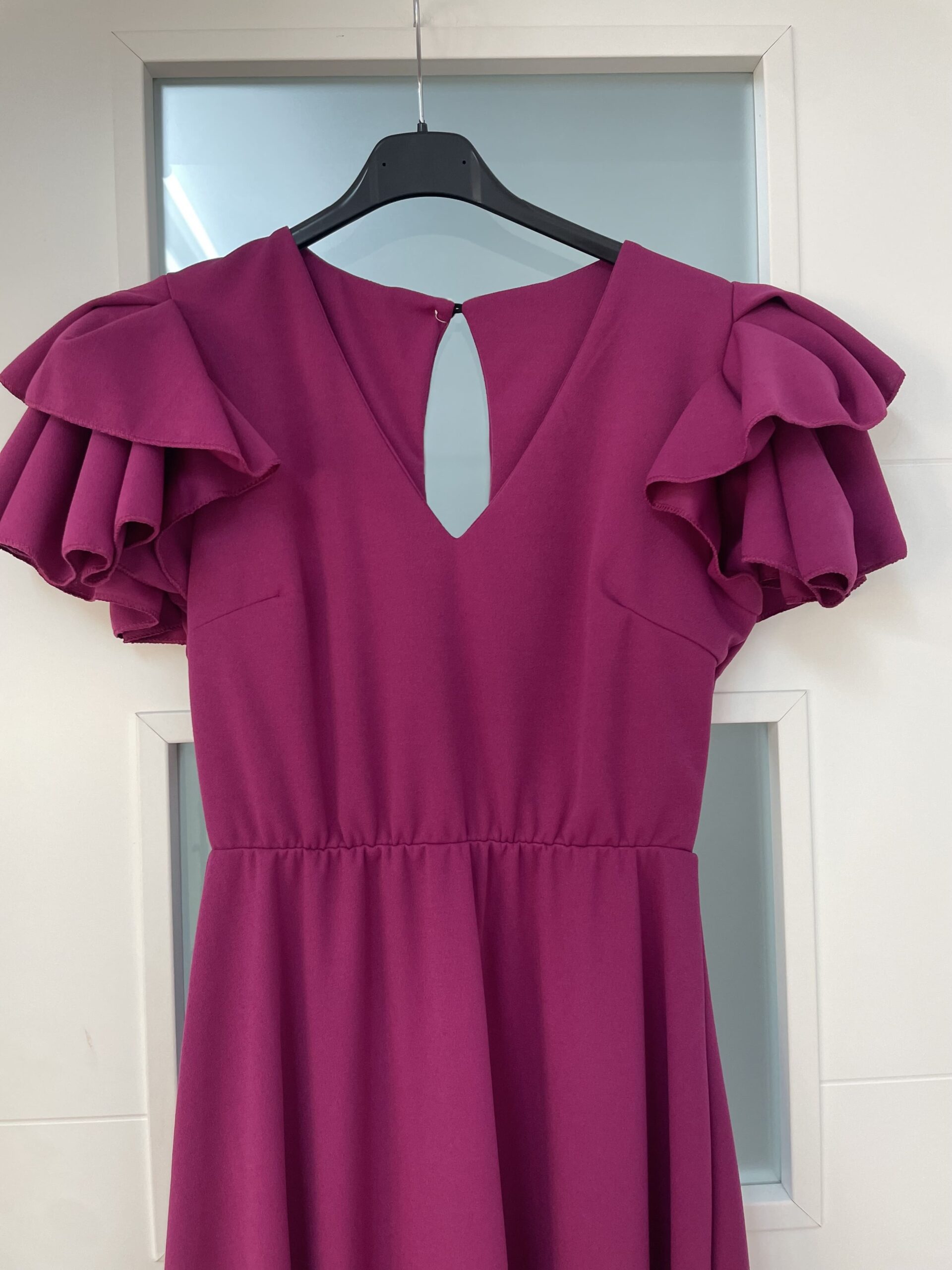 - Bata en tejido de Crepé elástico ,corte en la cintura y un solo volante ,espalda descubierta con cierre de botón dorado