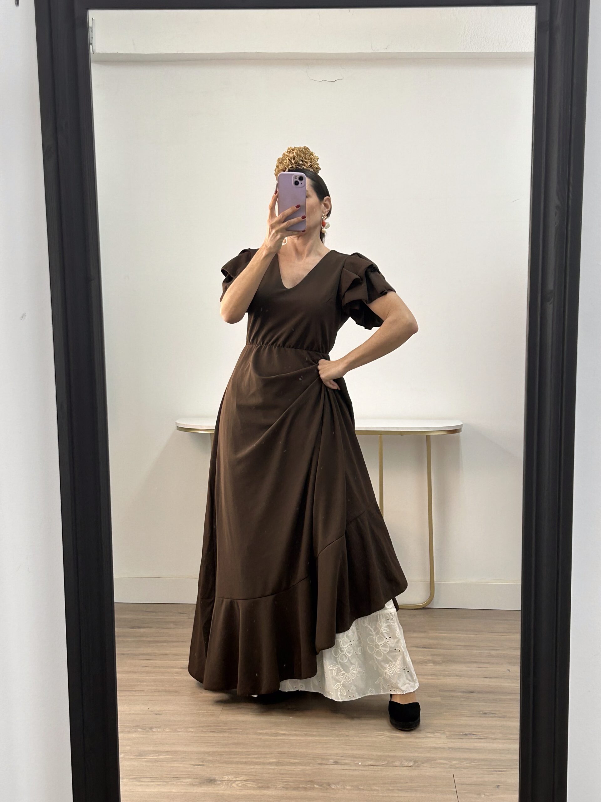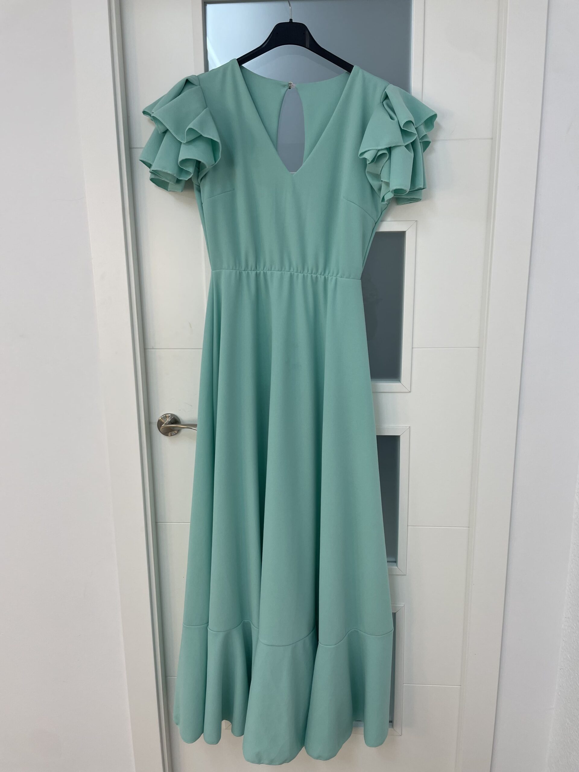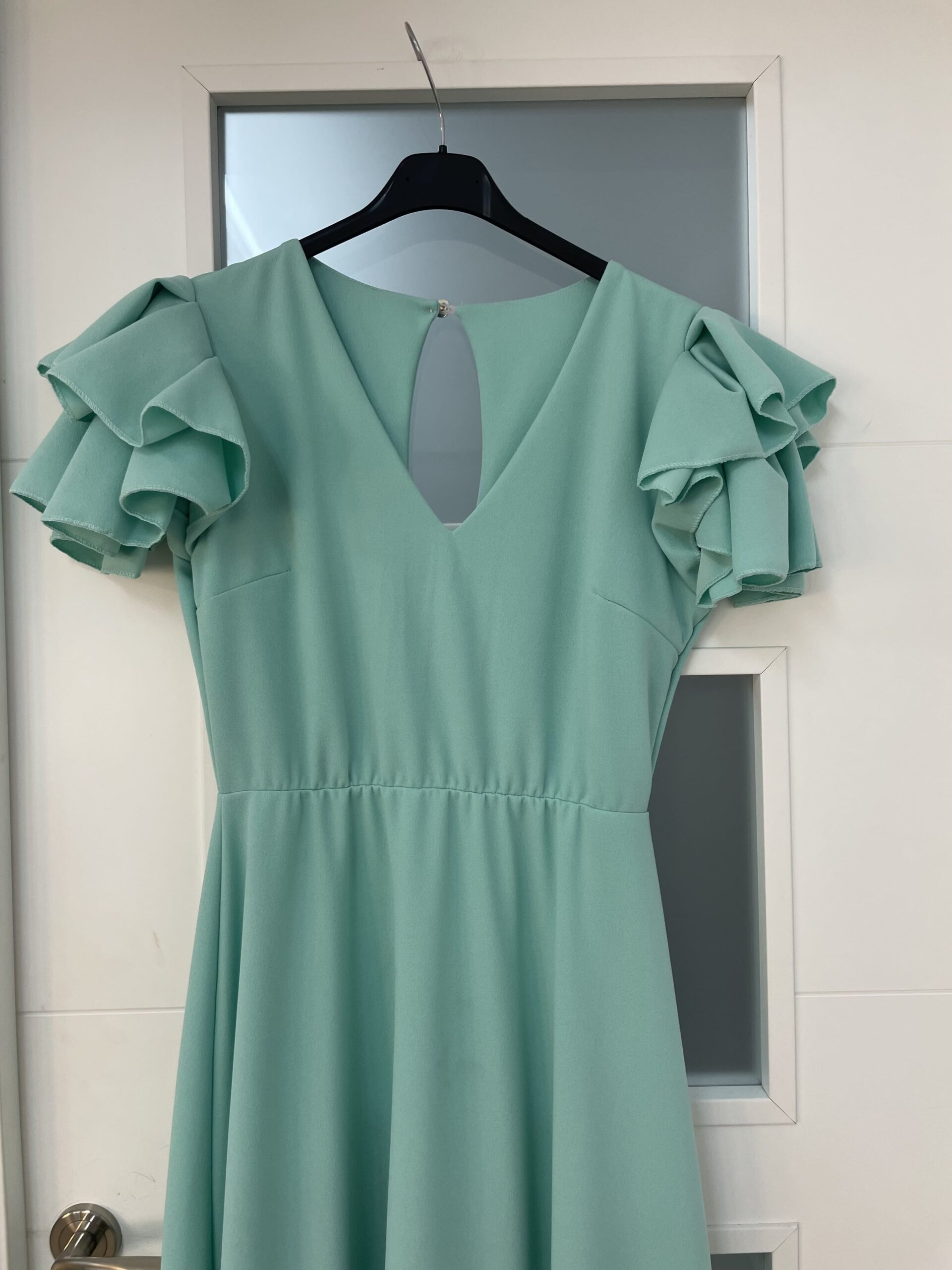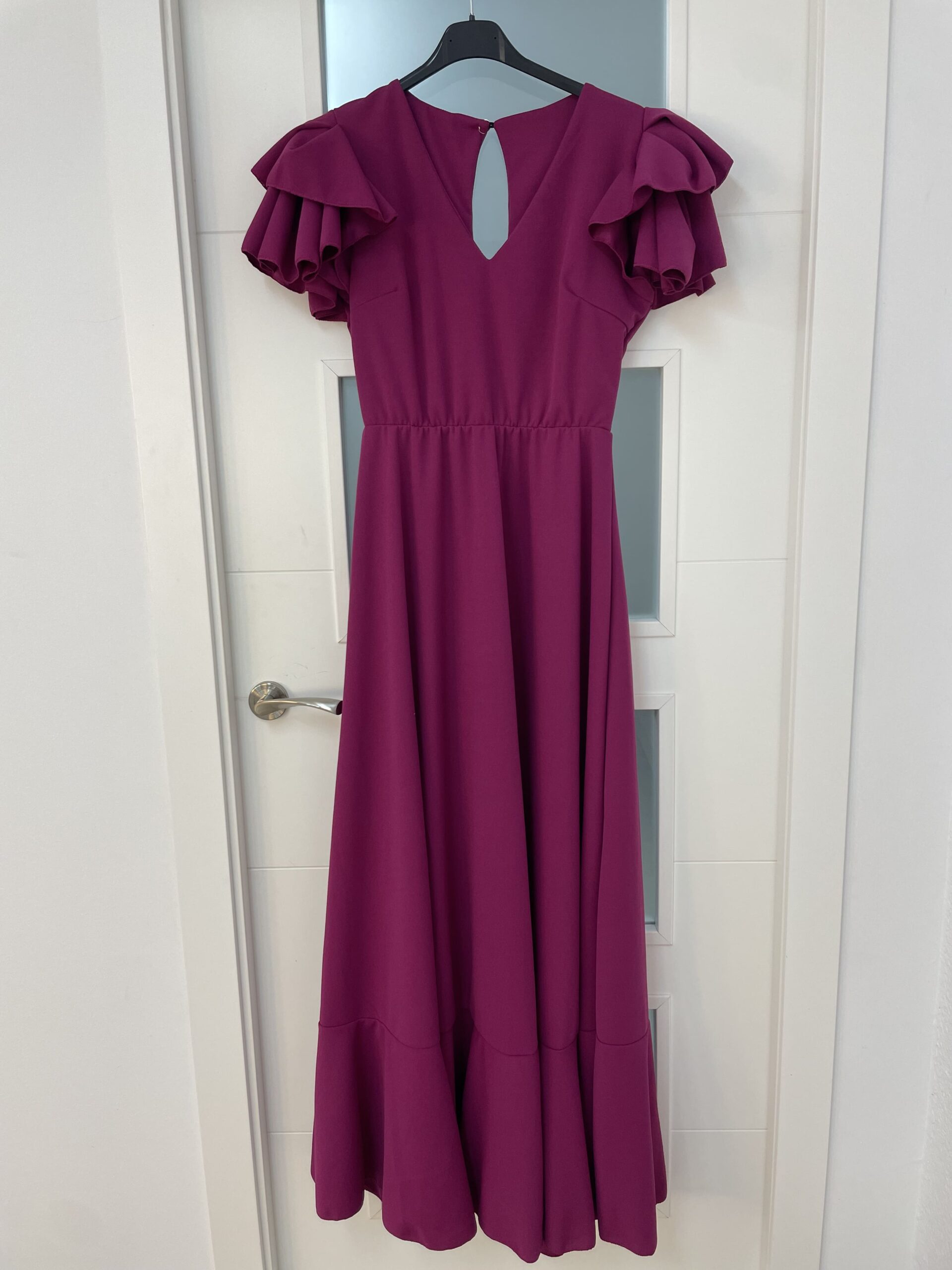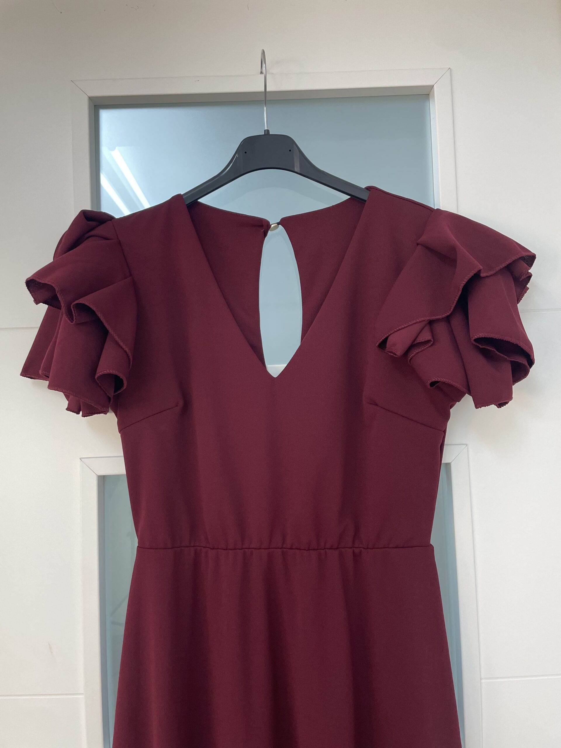 - Bata en tejido de Crepé elástico ,corte en la cintura y un solo volante ,espalda descubierta con cierre de botón dorado