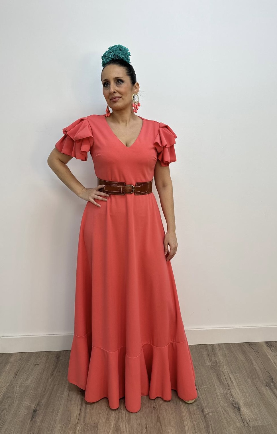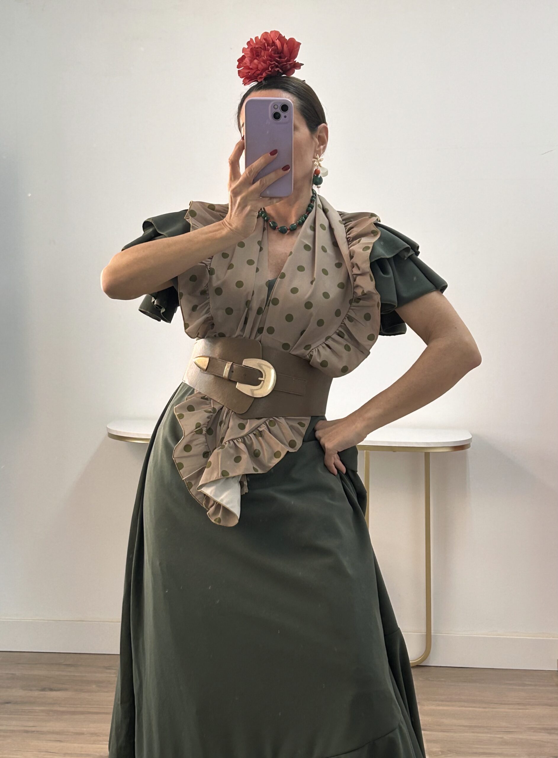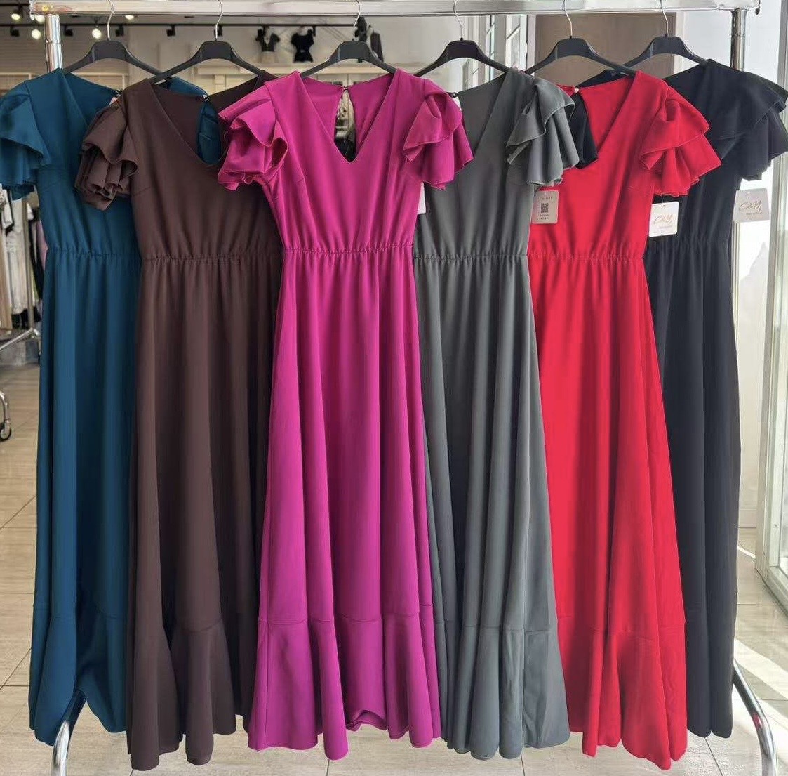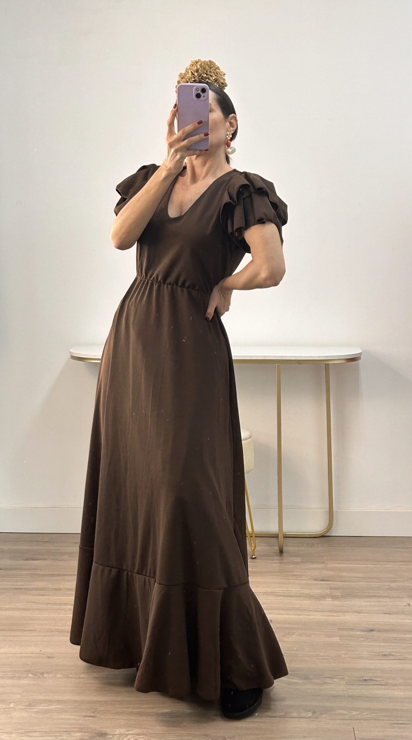 - Bata en tejido de Crepé elástico ,corte en la cintura y un solo volante ,espalda descubierta con cierre de botón dorado