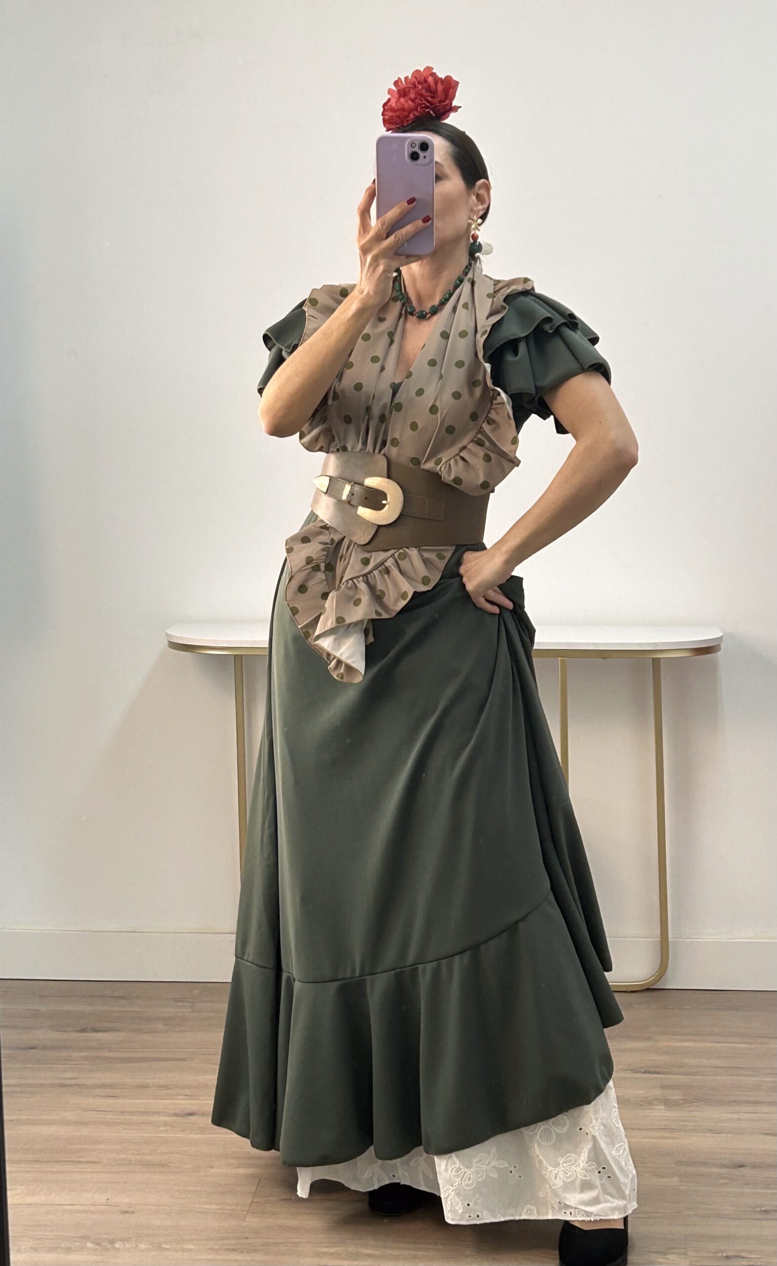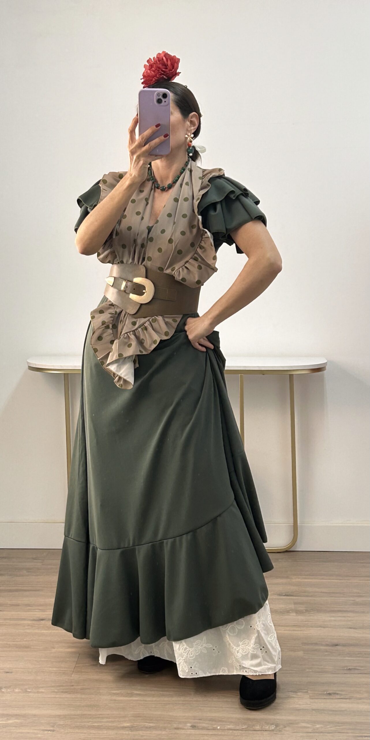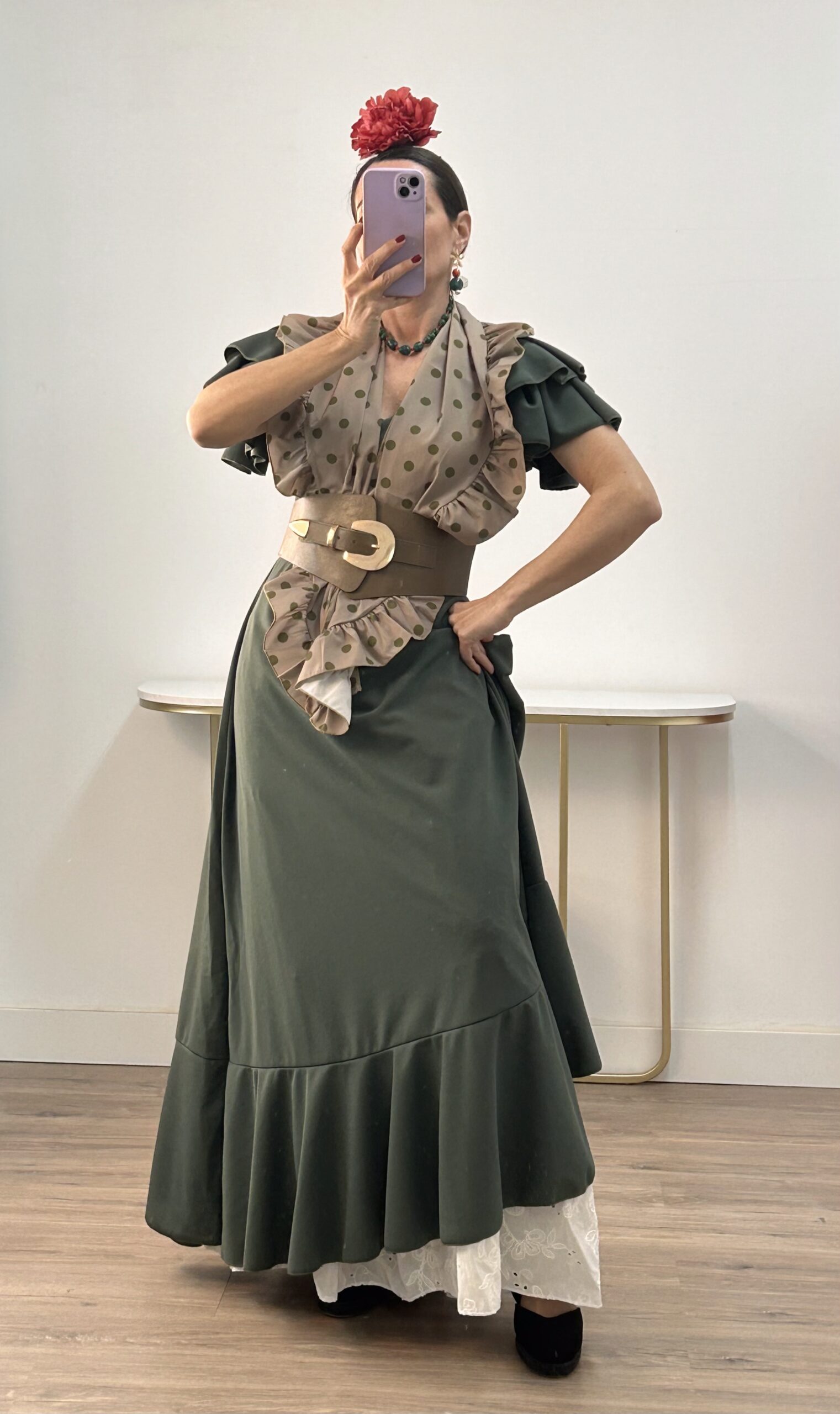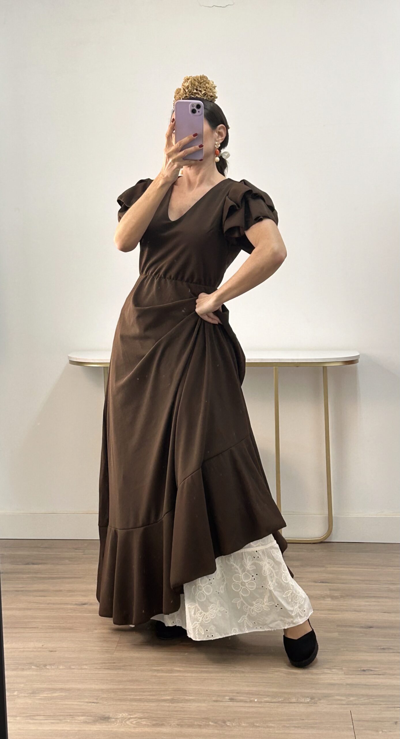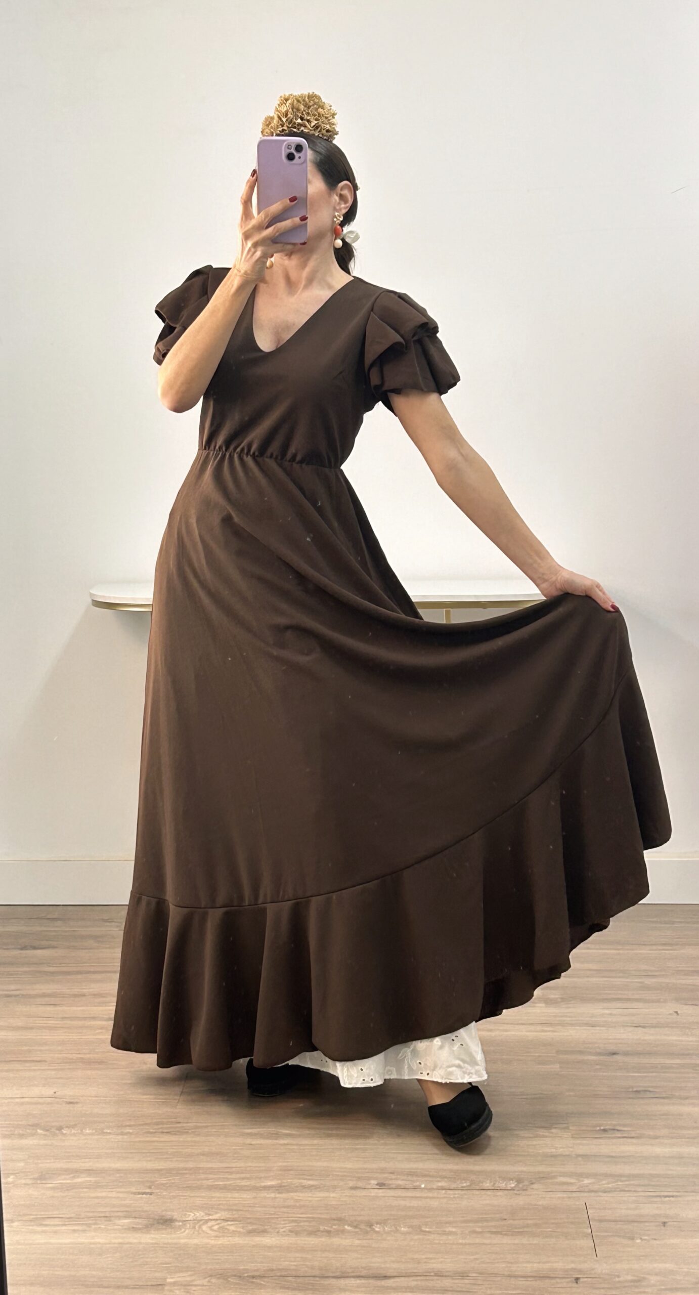 - Bata en tejido de Crepé elástico ,corte en la cintura y un solo volante ,espalda descubierta con cierre de botón dorado