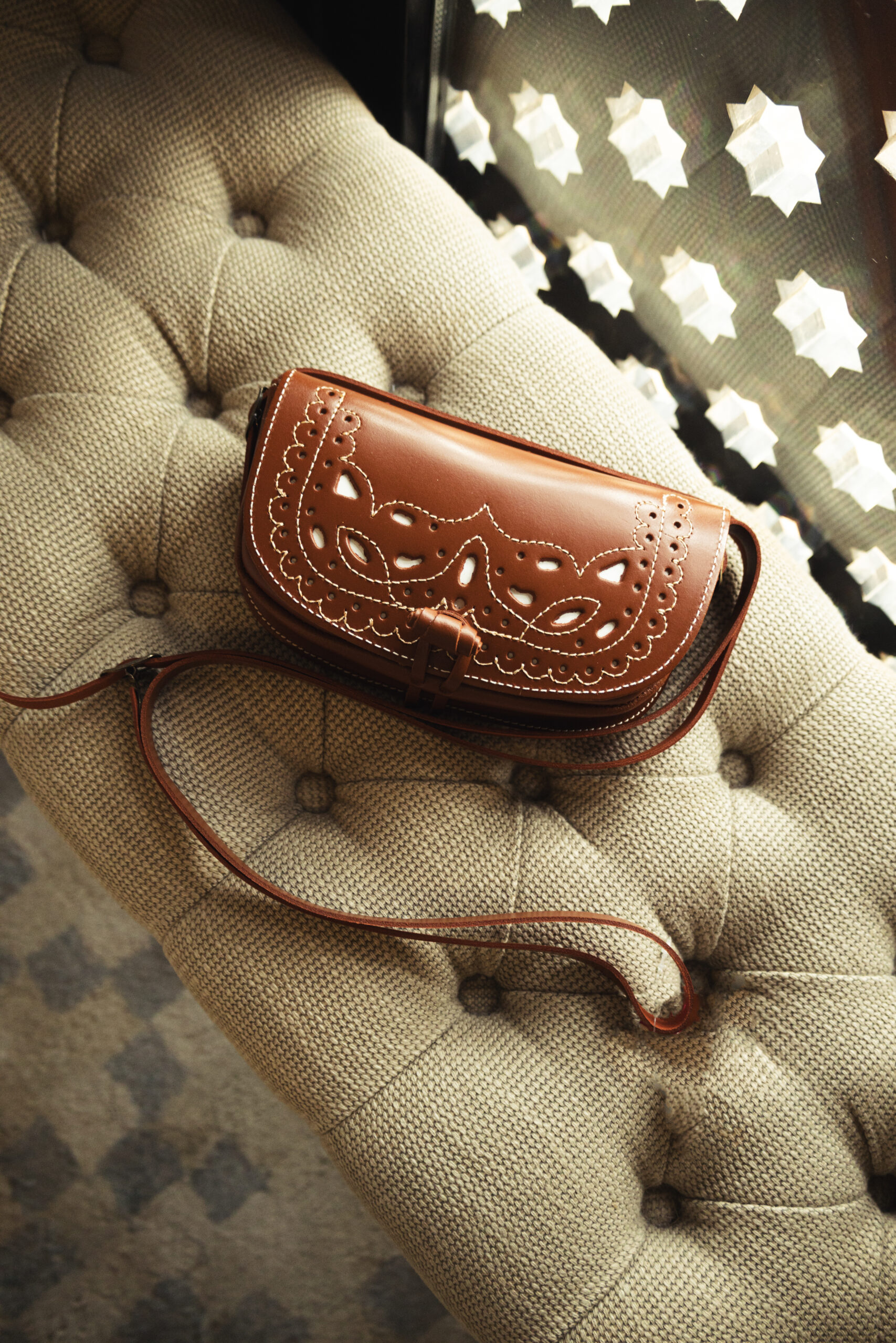 - Bolso picao con borlón de broche.