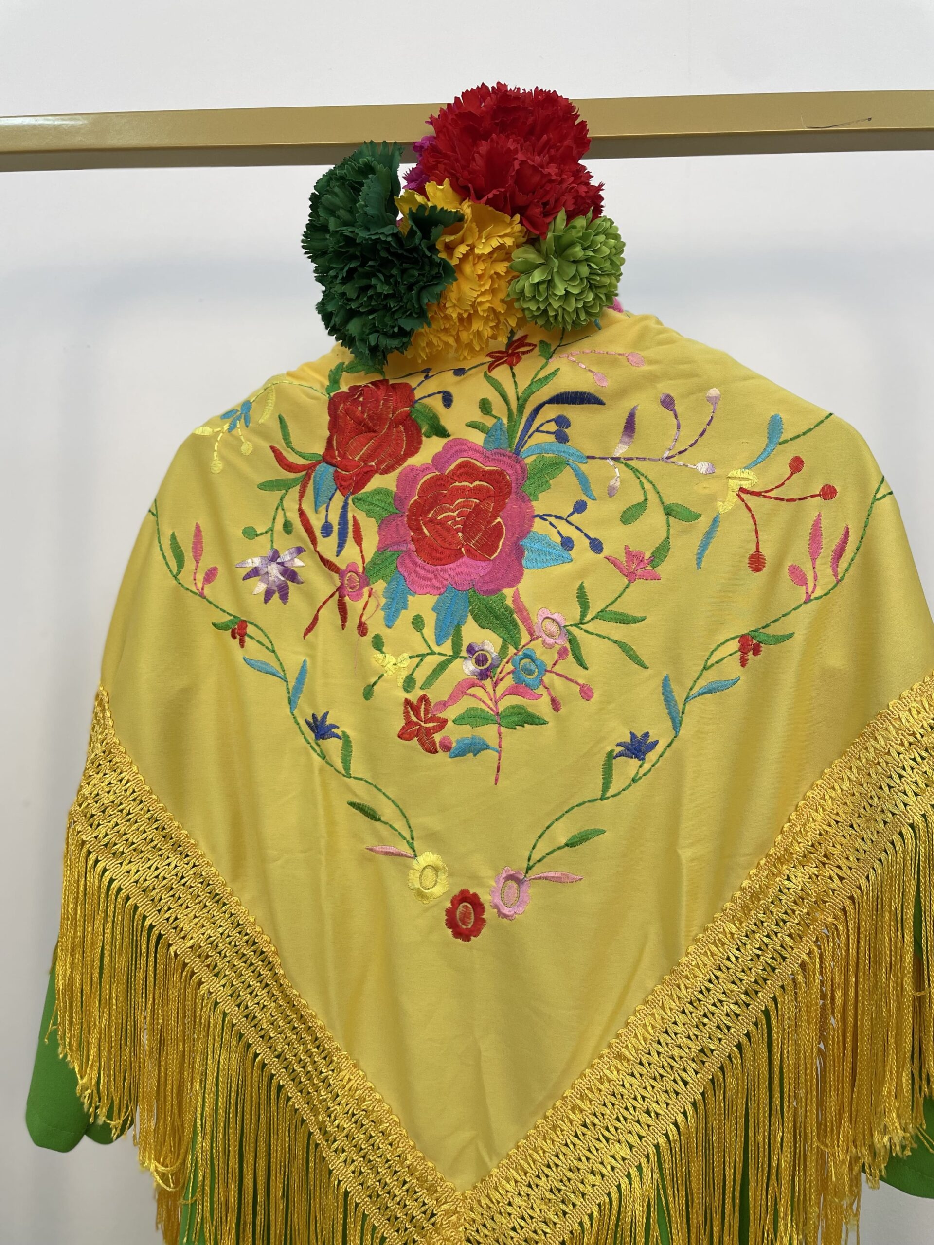 - Mantón amarillo con bordado de colores.