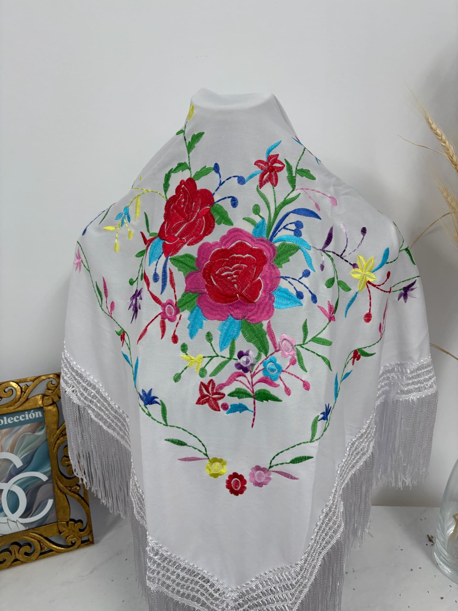 1. Mantón en color Blanco con bordado de 2 rosas en varios colores.