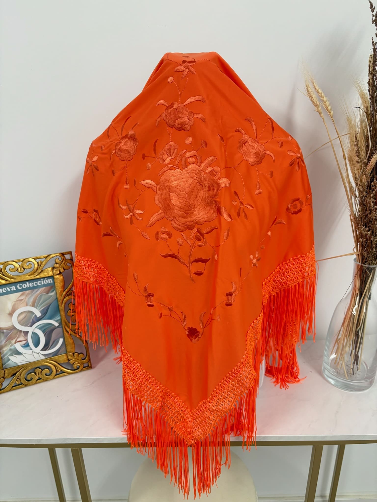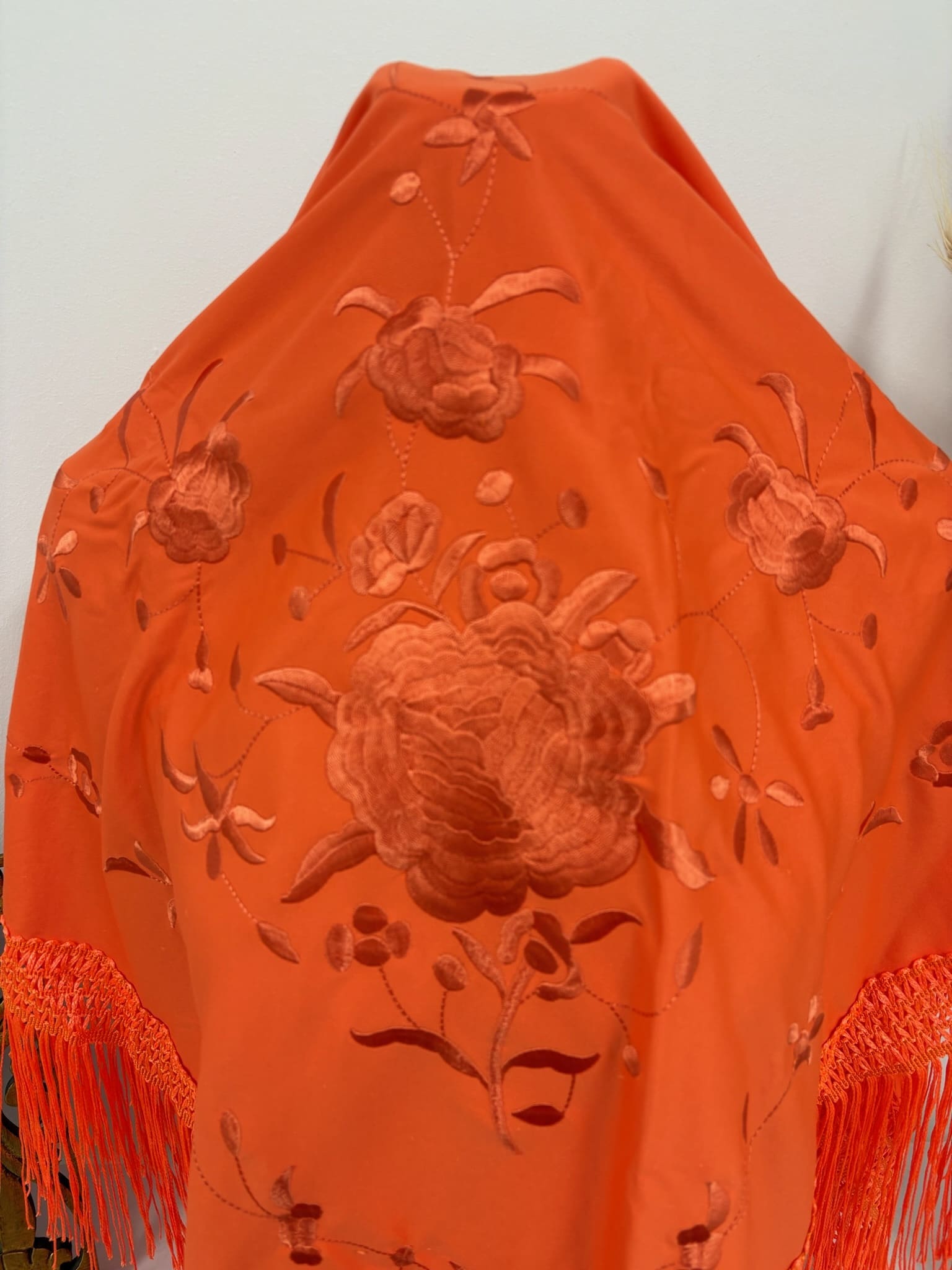- Mantón en color Naranja con bordado de 1 rosa en el mismo tono.