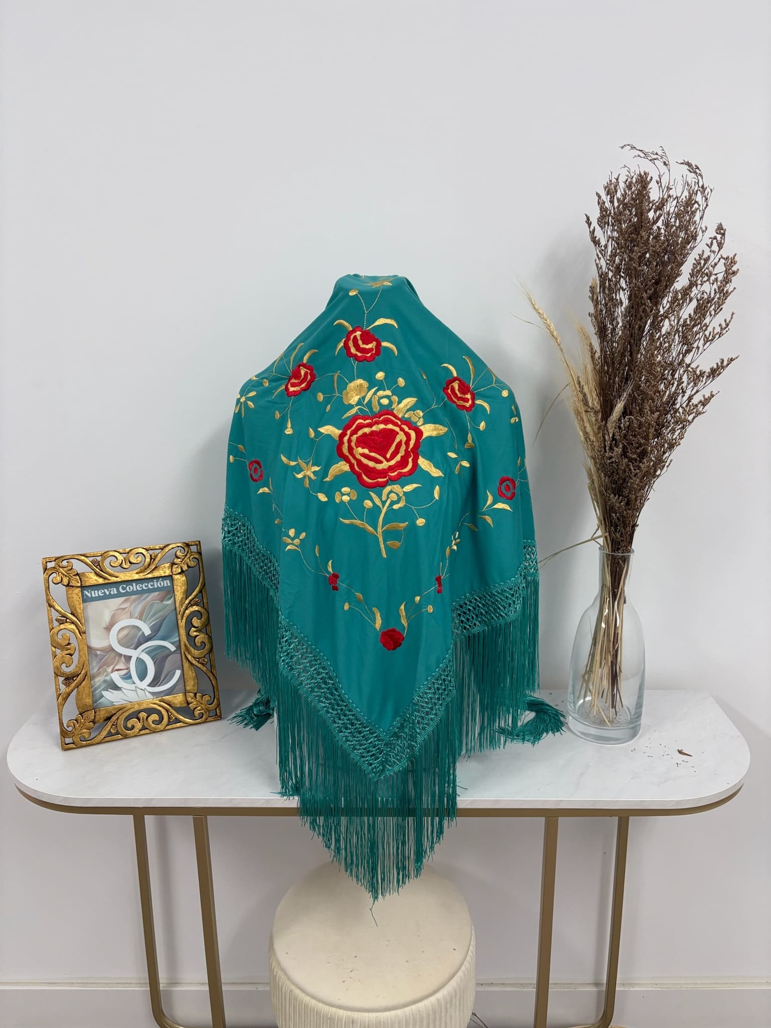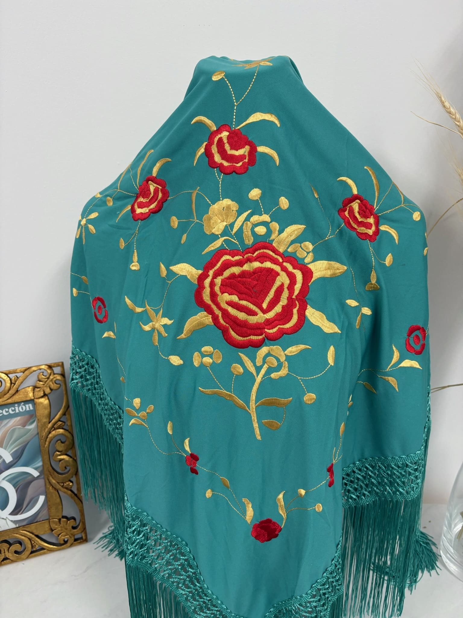 - Mantón en color Petróleo con bordado de 1 rosa en color rojo y dorado.