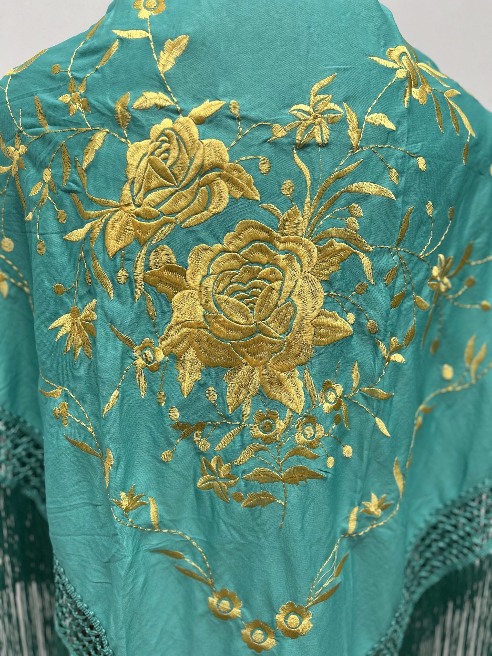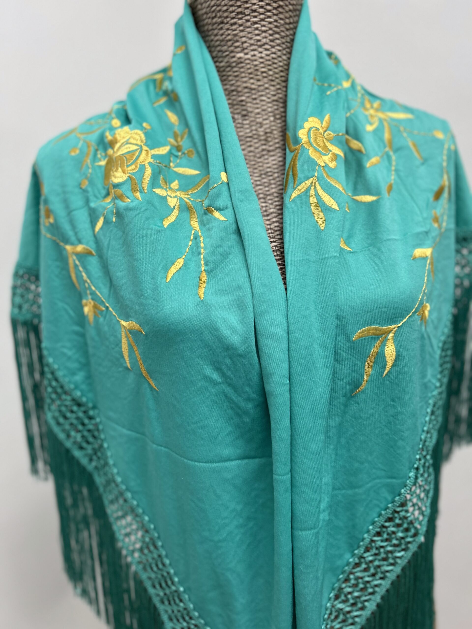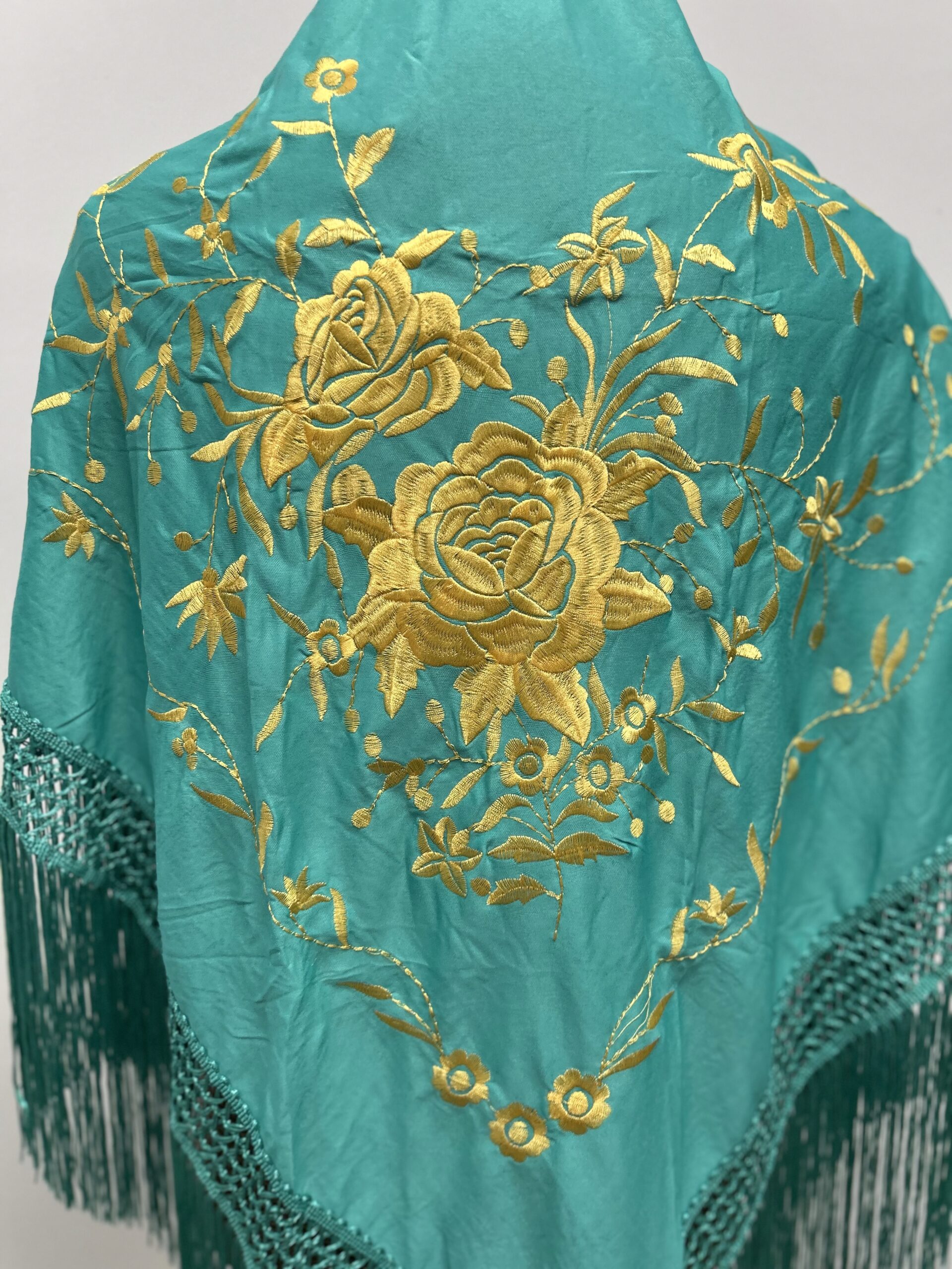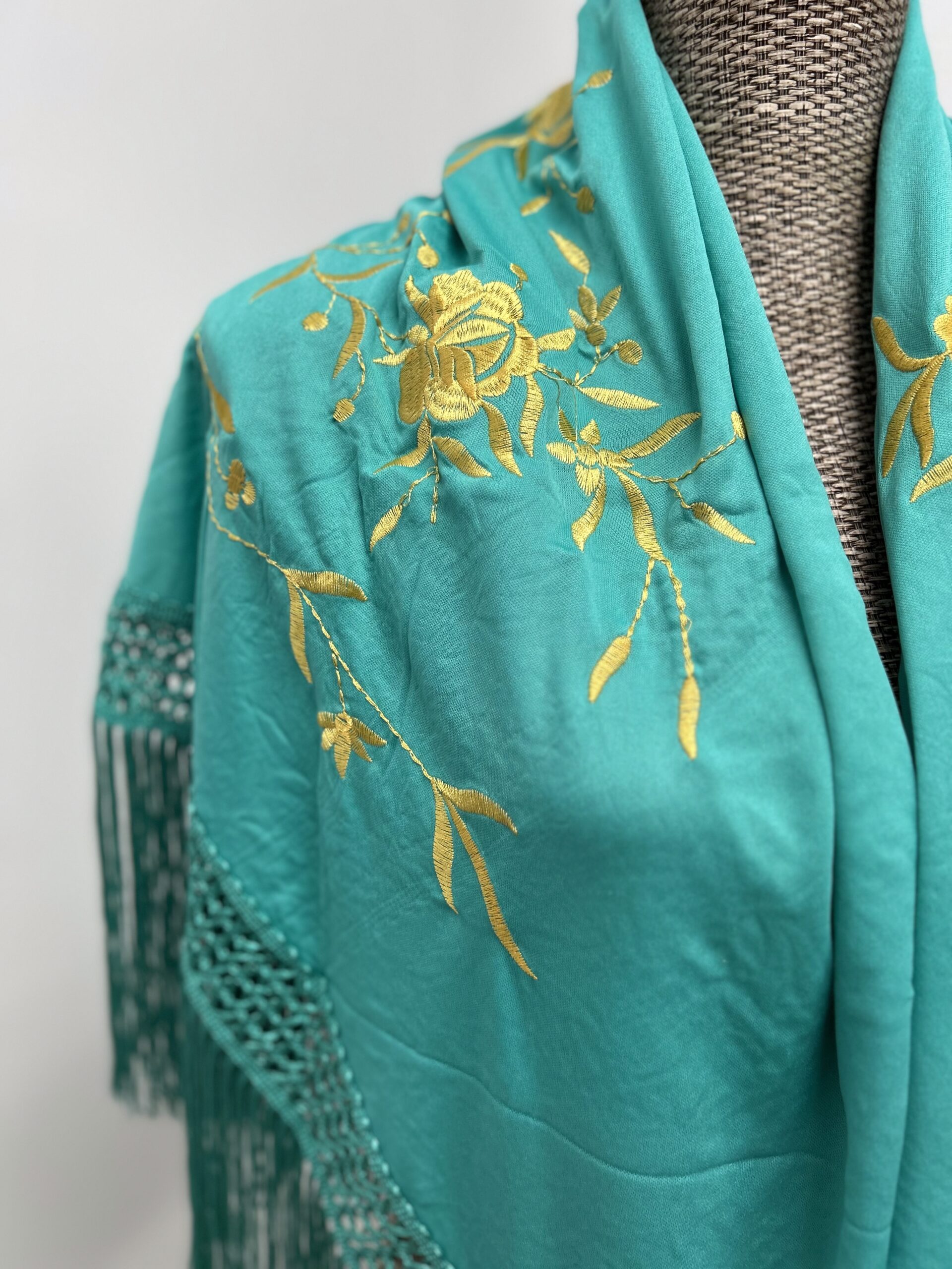 - Mantoncillo bordado color agua marina ,con dos flores doradas.