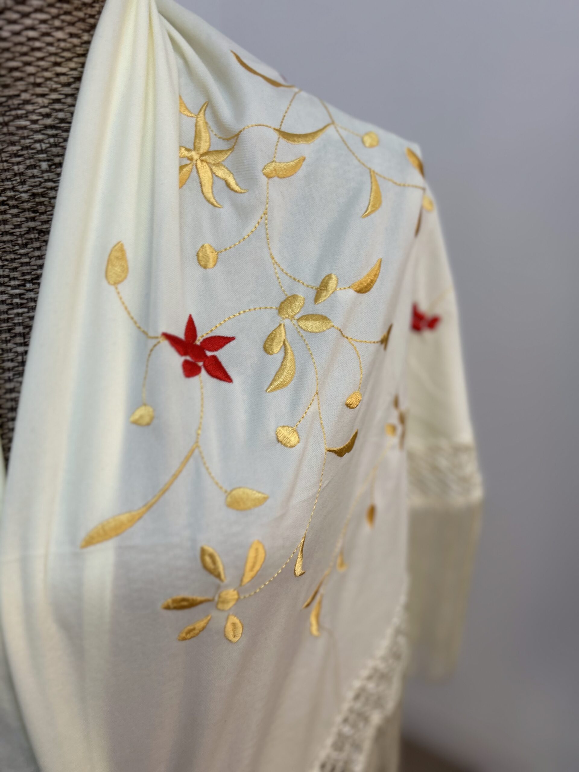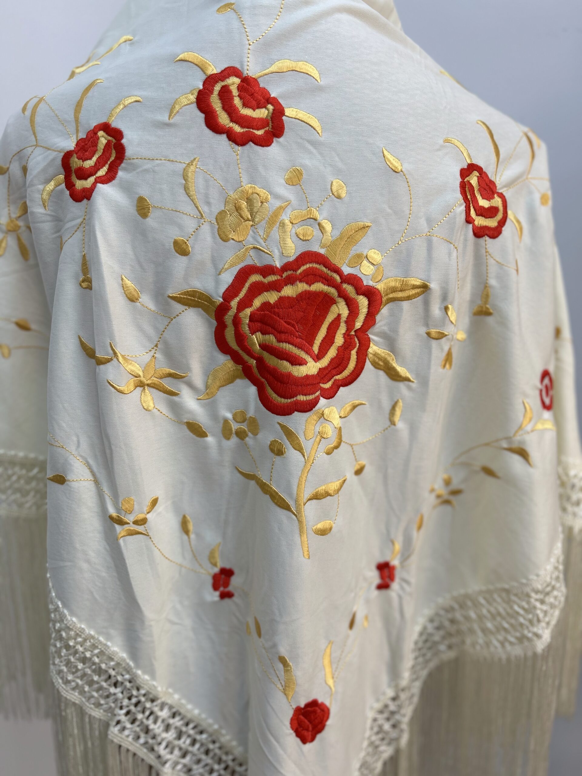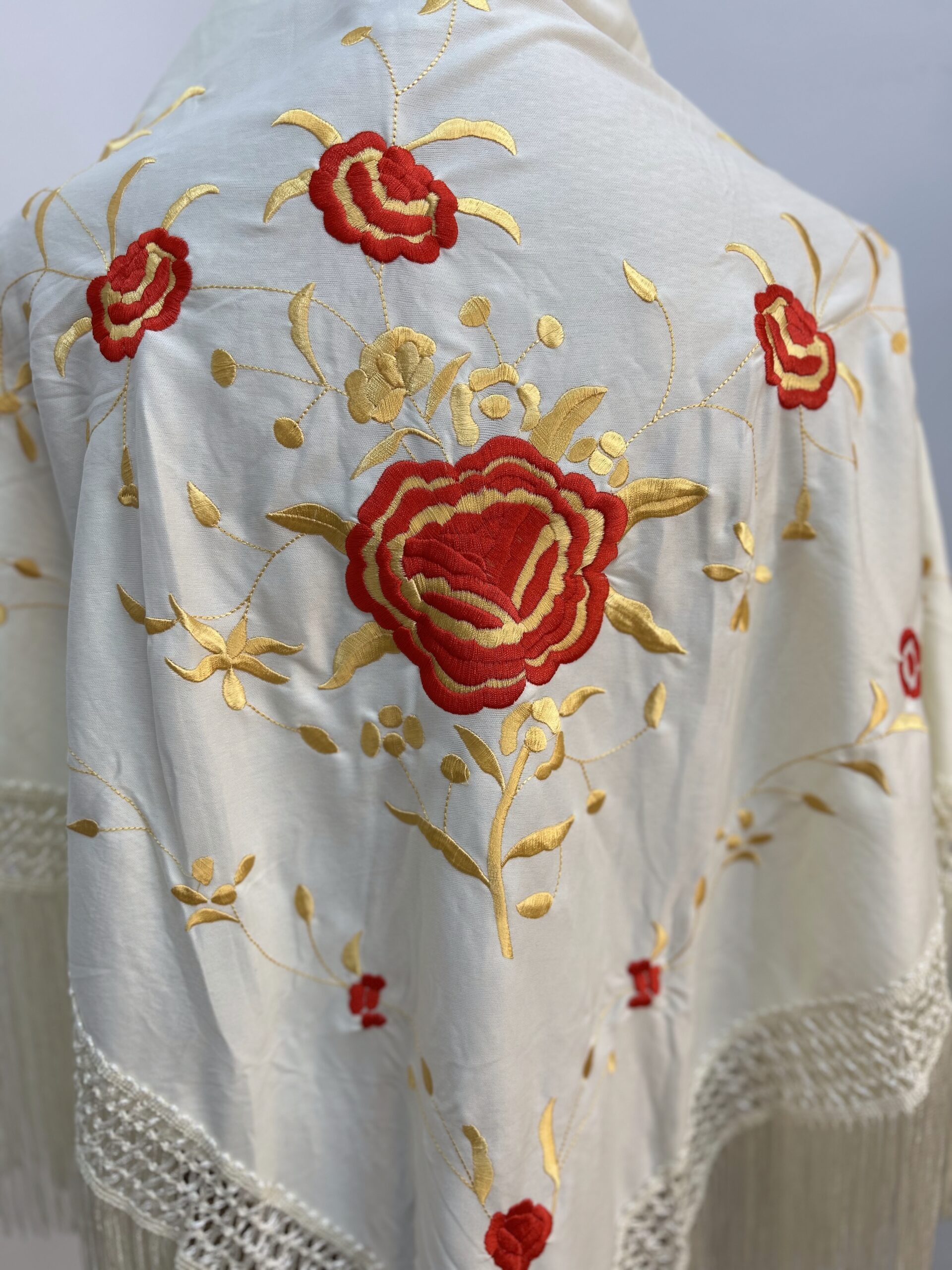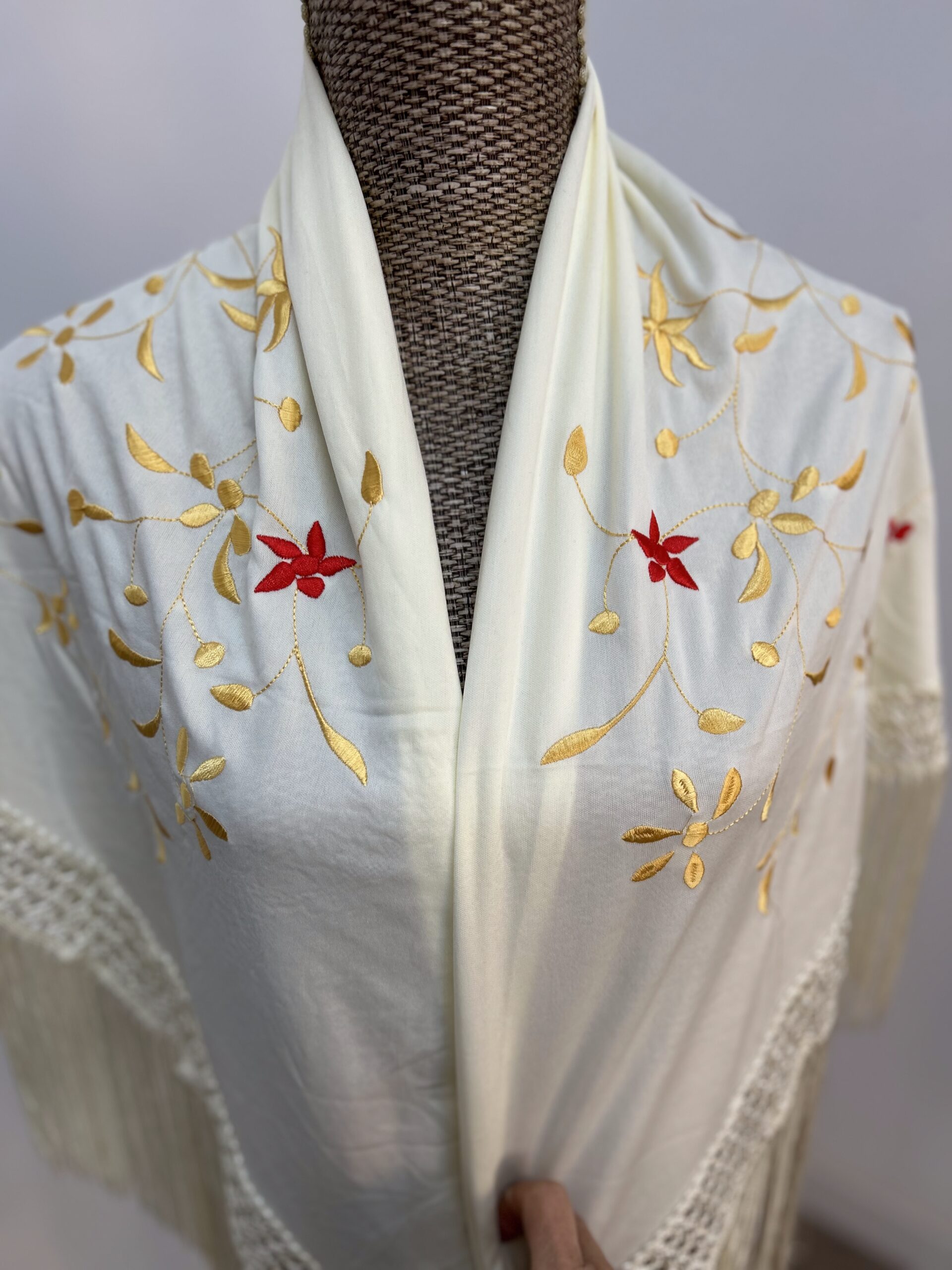 - Mantoncillo bordado color beige , flor dorada con rojo.