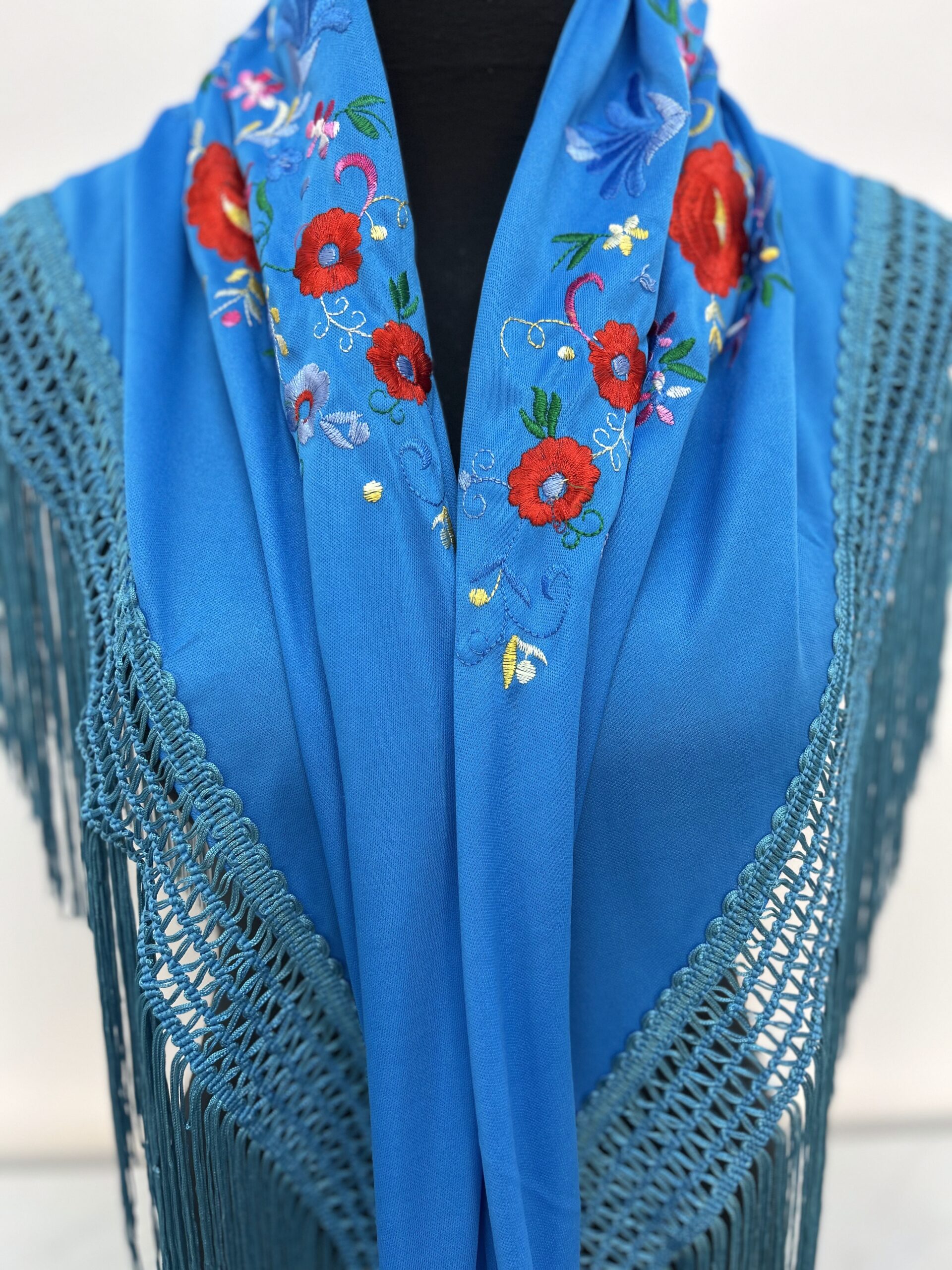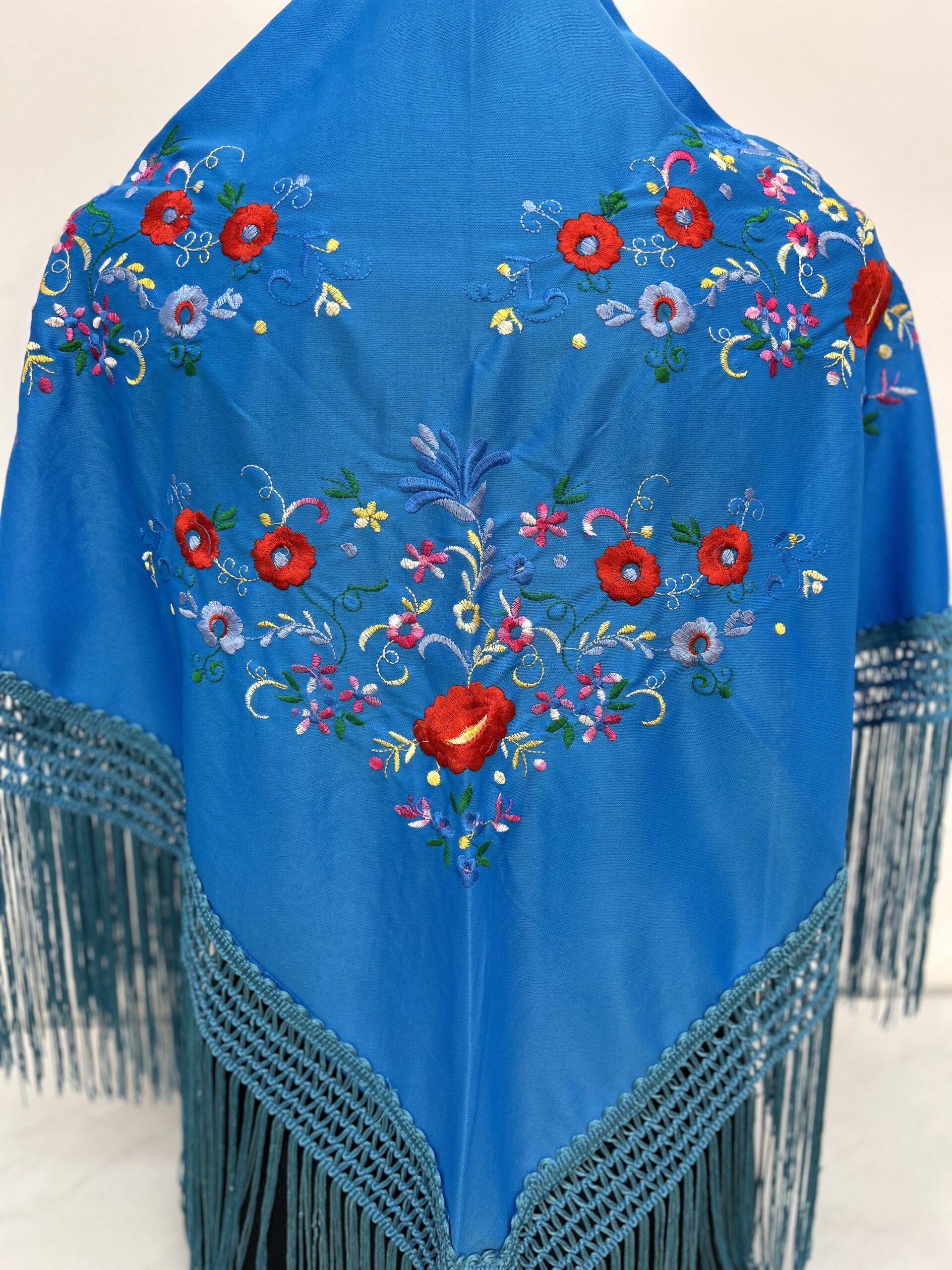 - Mantoncillo bordado color turquesa , con rosas de colores pequeñas .