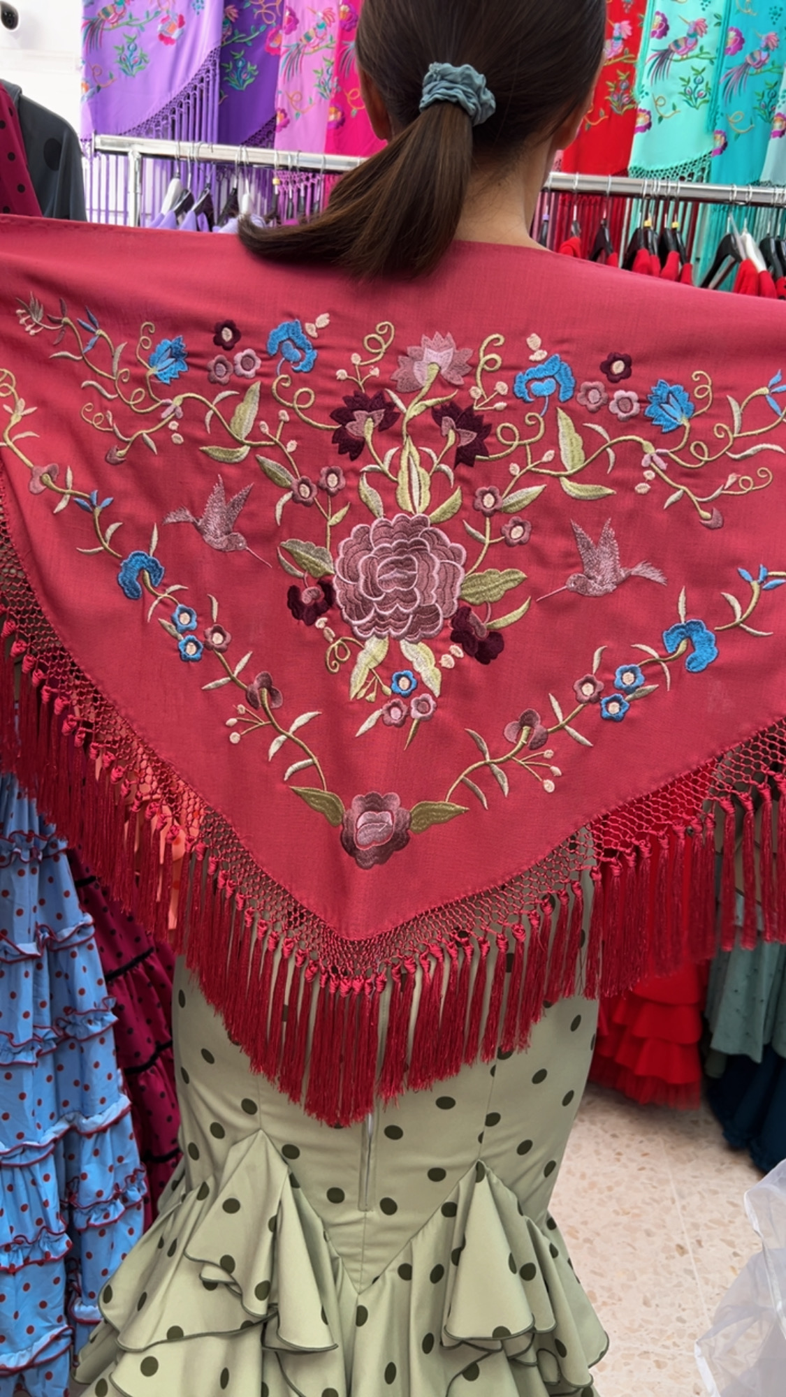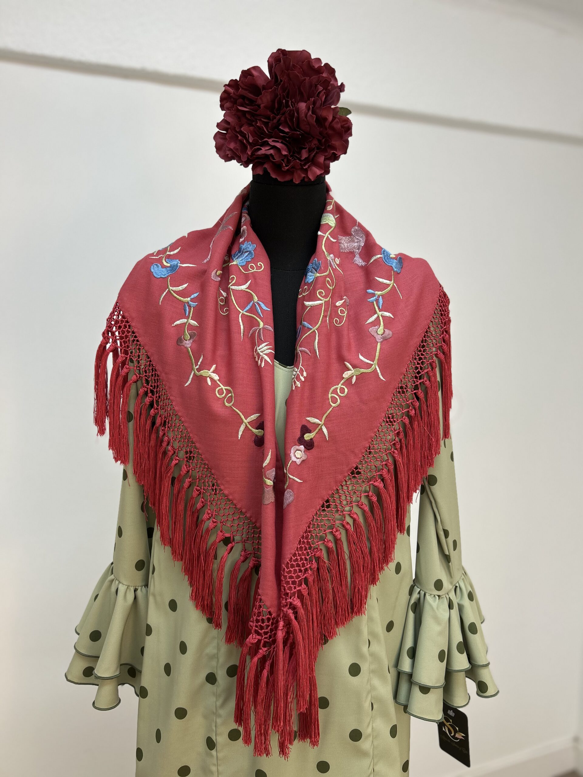 - Mantoncillo Bordado en Seda y Flecado en Seda en tejido de Crespón.