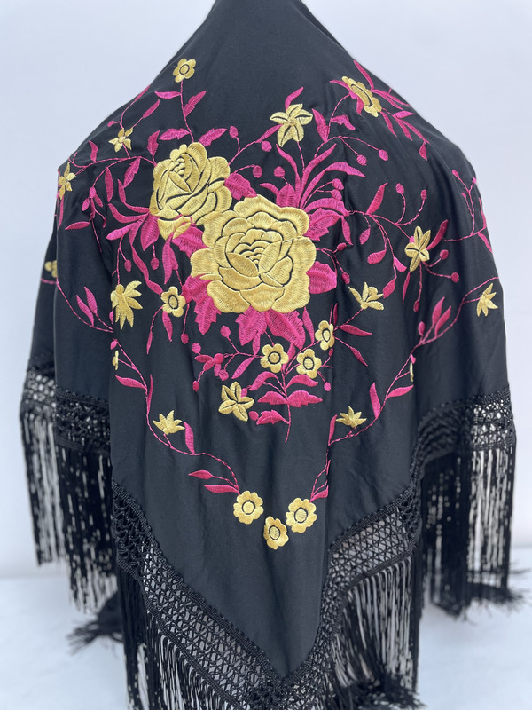 - Mantón en color Negro ,bordado con Rosas grandes en color Fucsia y Dorado.