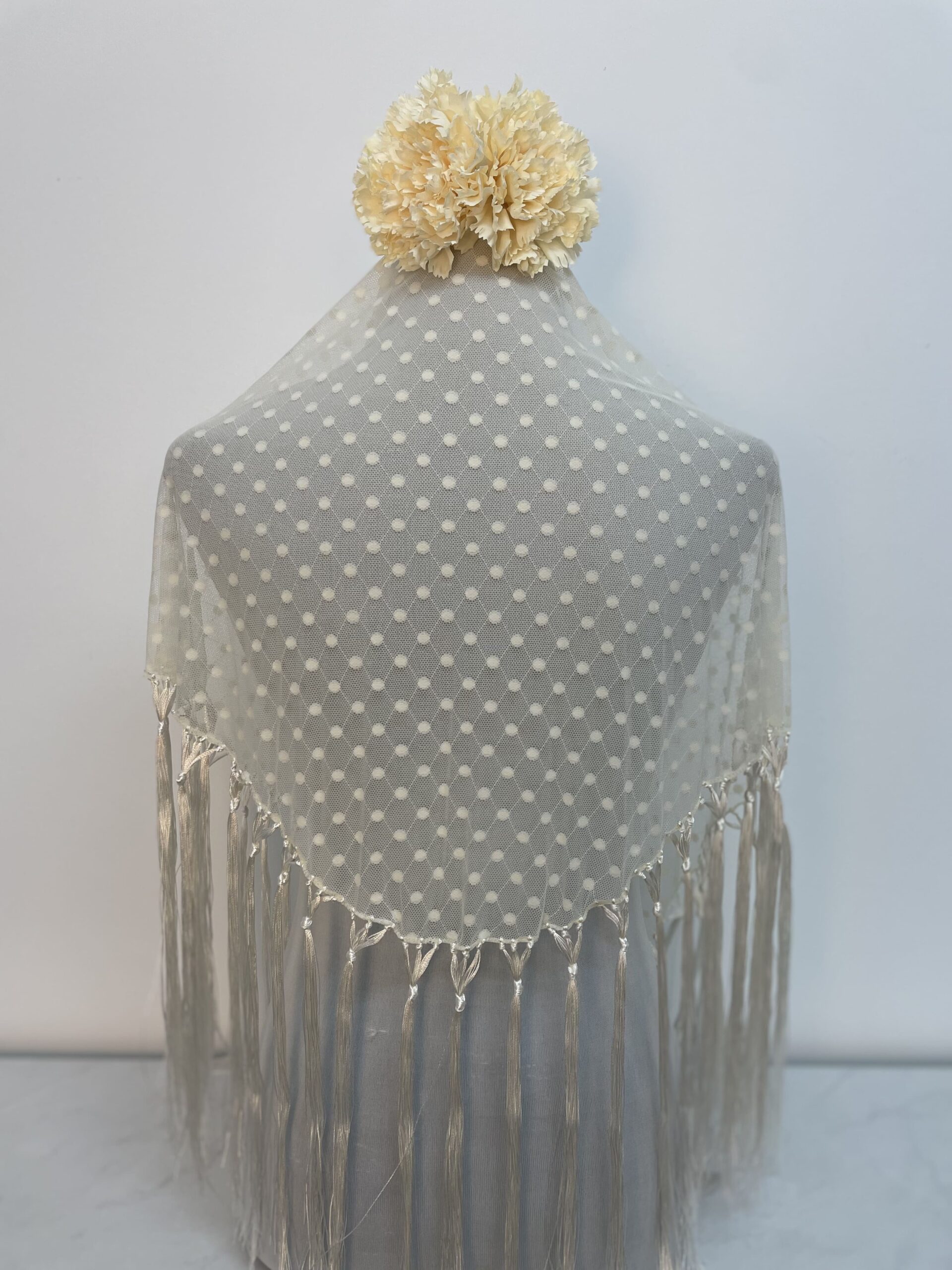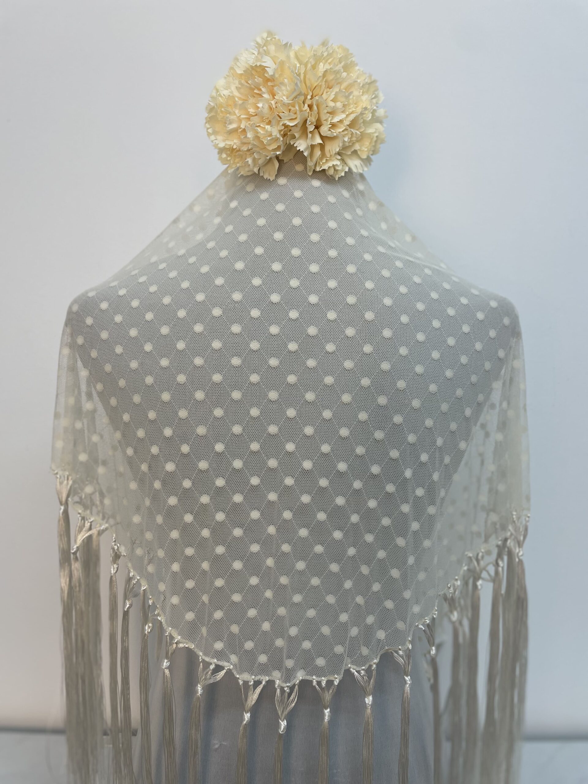 - Mantoncillo en tela de plumeti con el fleco en el mismo color.