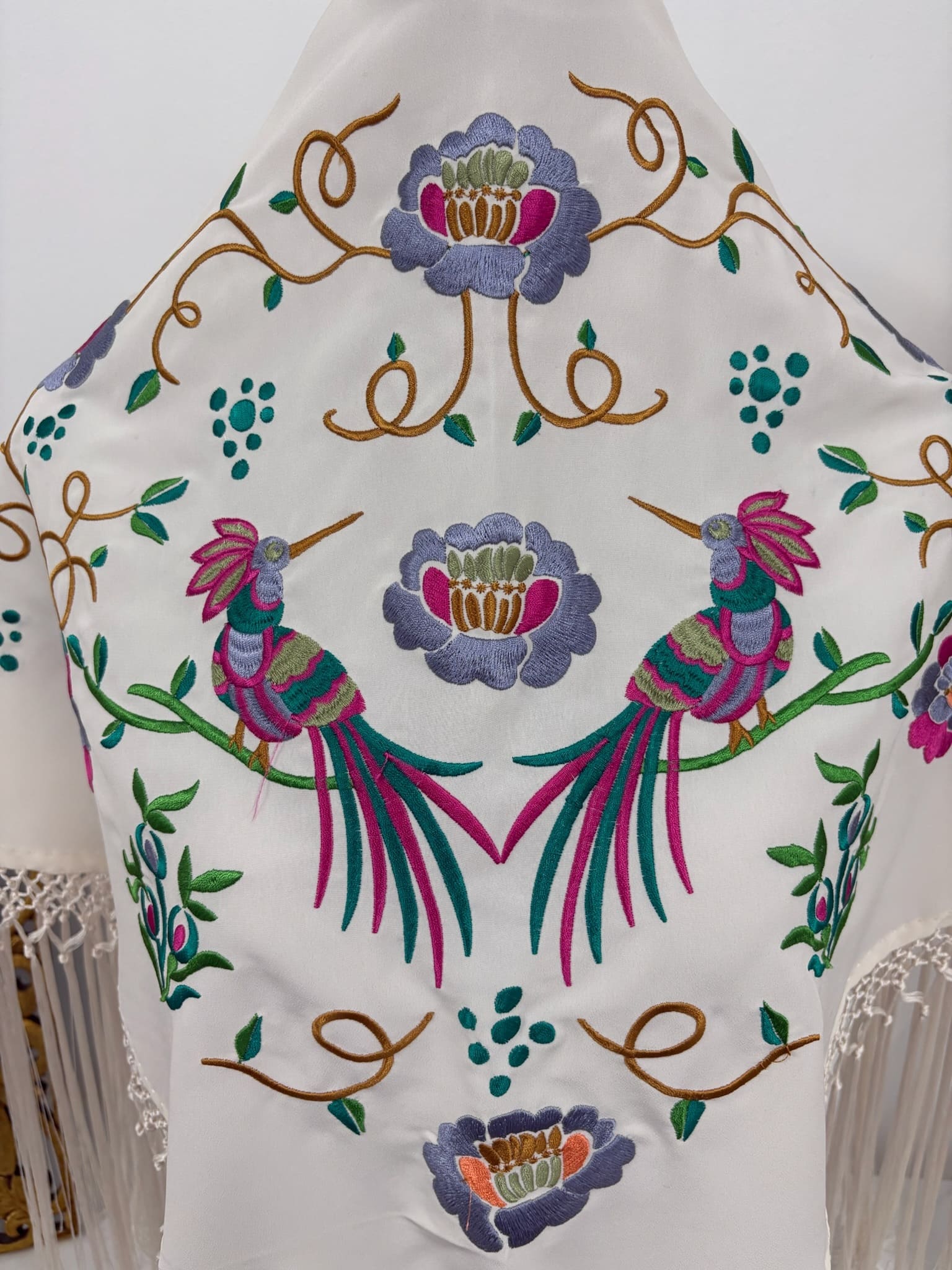 - Bordado colorido con dos pájaros centrales y enmarcados en flores.