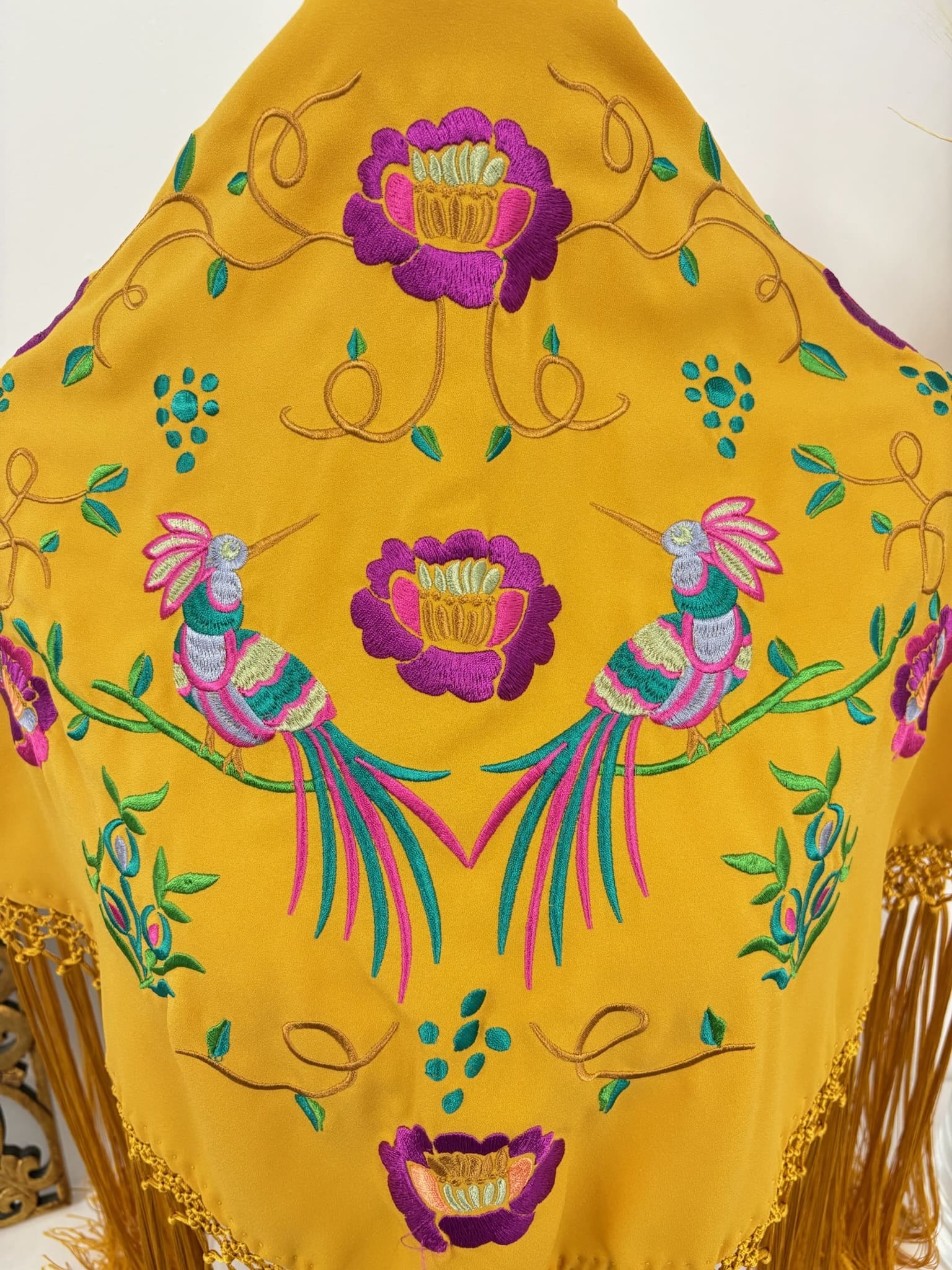 - Bordado colorido con dos pájaros centrales y enmarcados en flores.