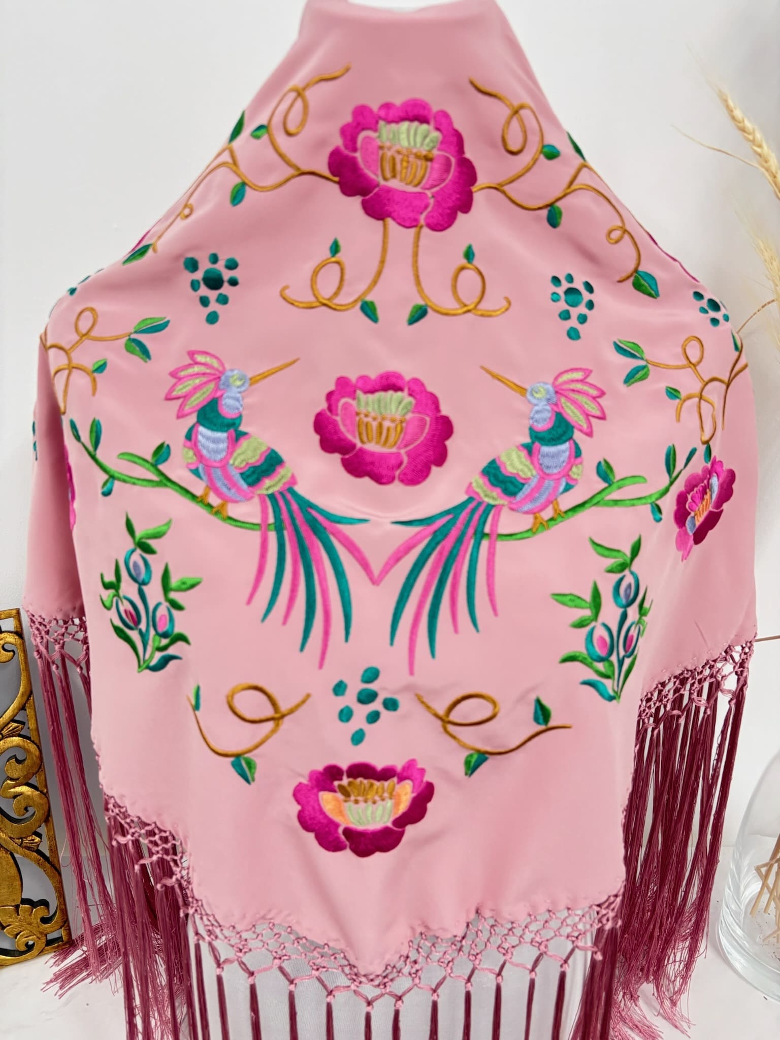 - Bordado colorido con dos pájaros centrales y enmarcados en flores.