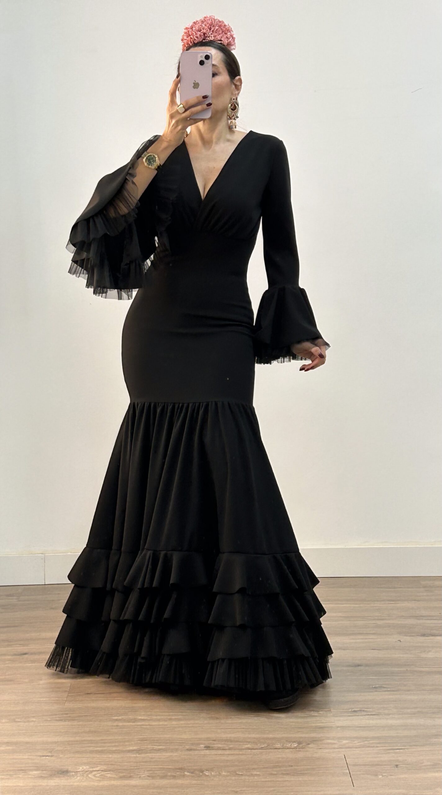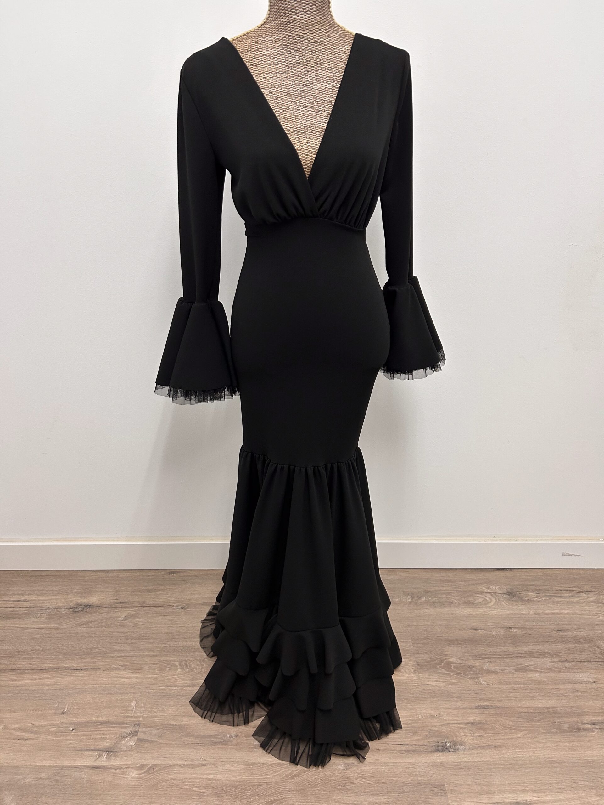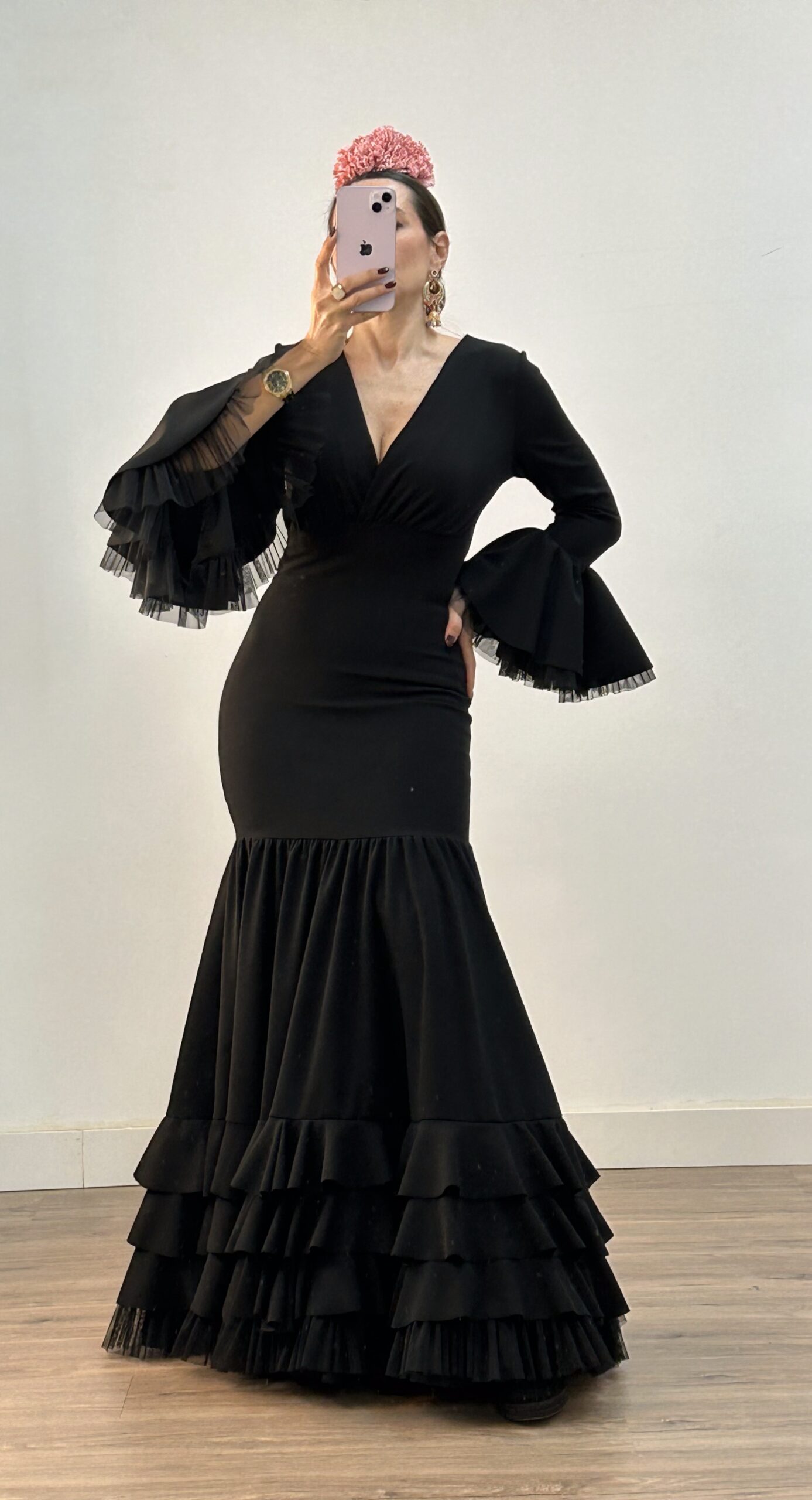 - Tejido de crepe elástico en color Negro ,lleva un buen escote por delante de 33 cm y por detrás de 28 cm.