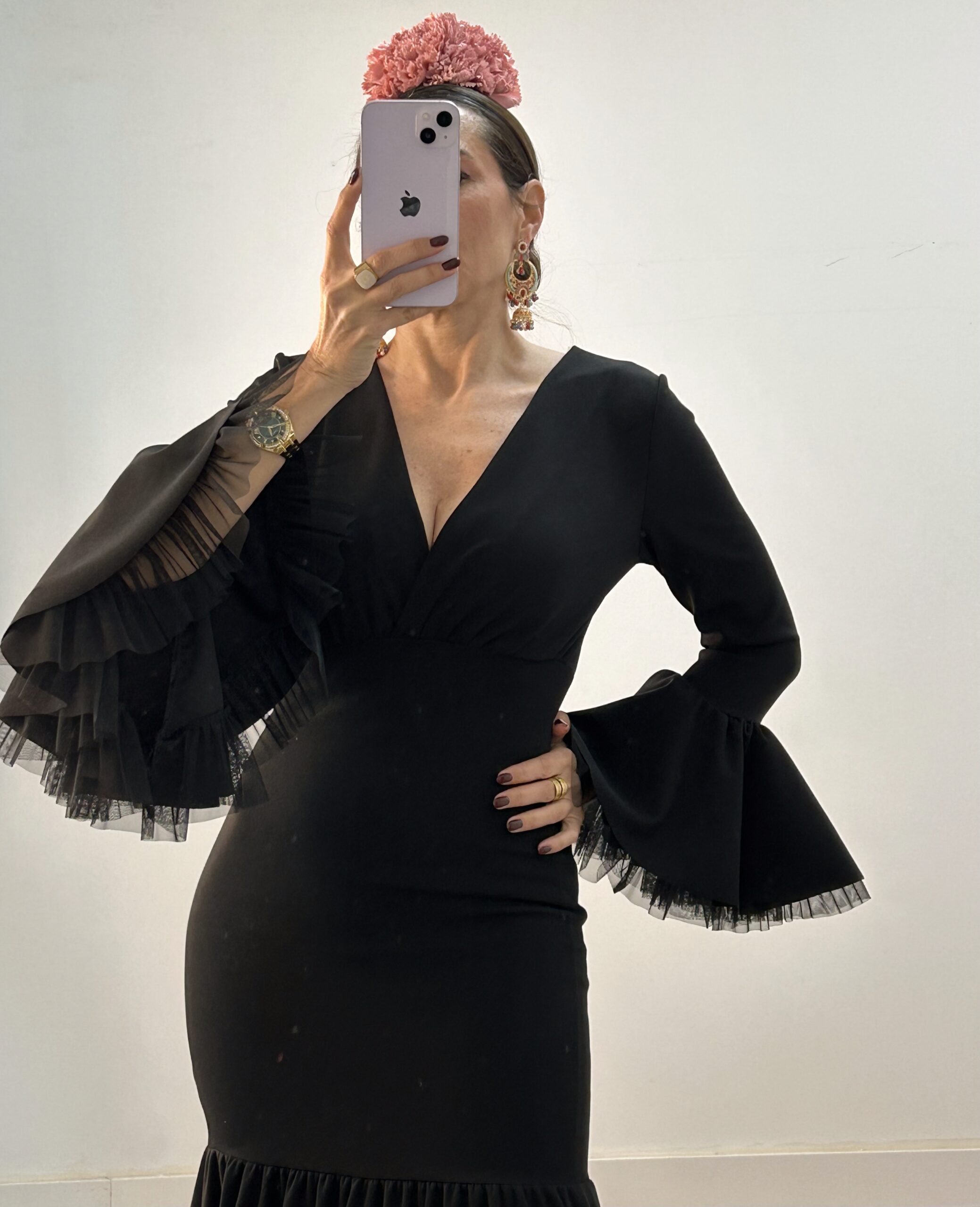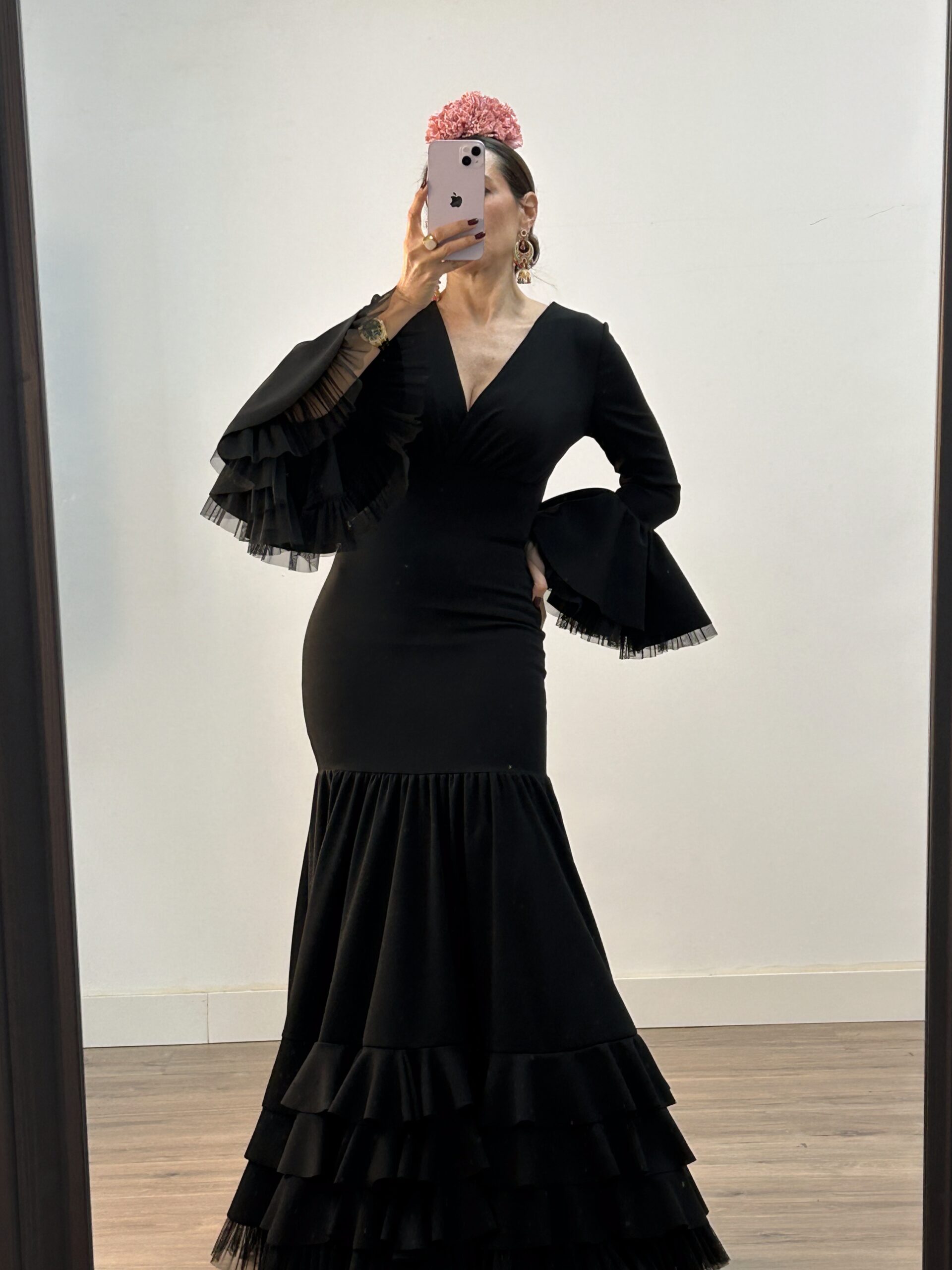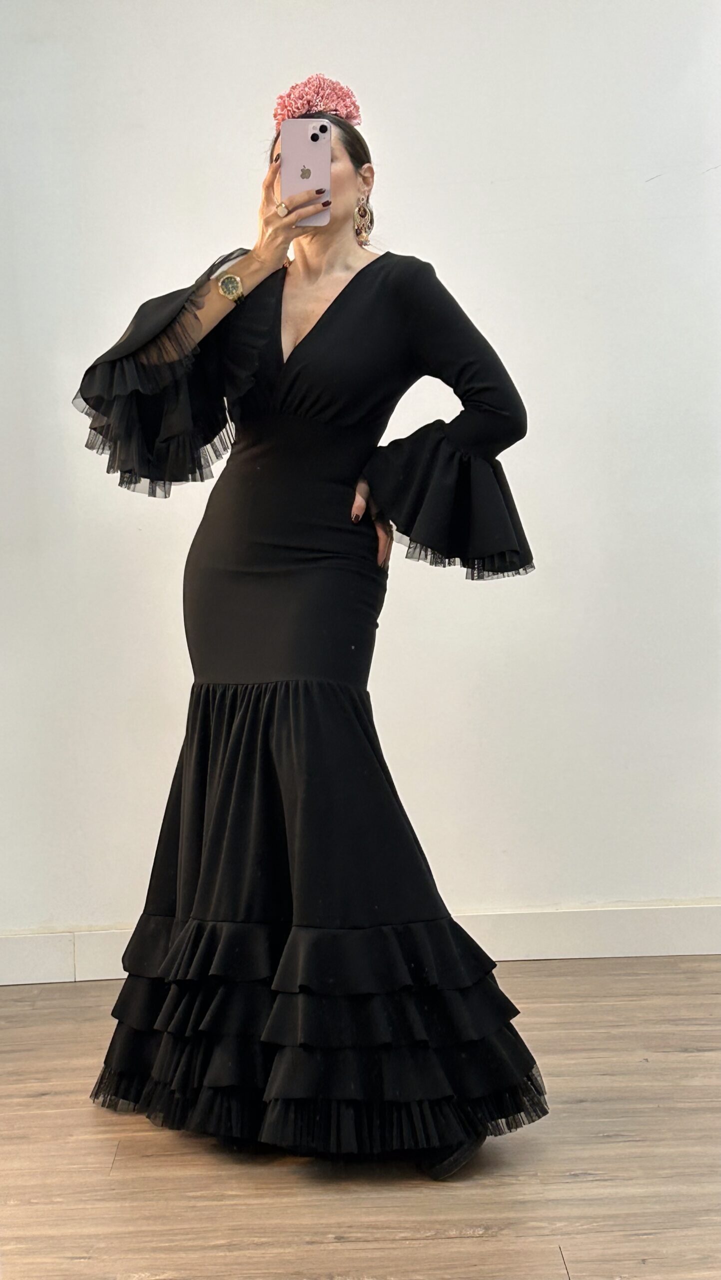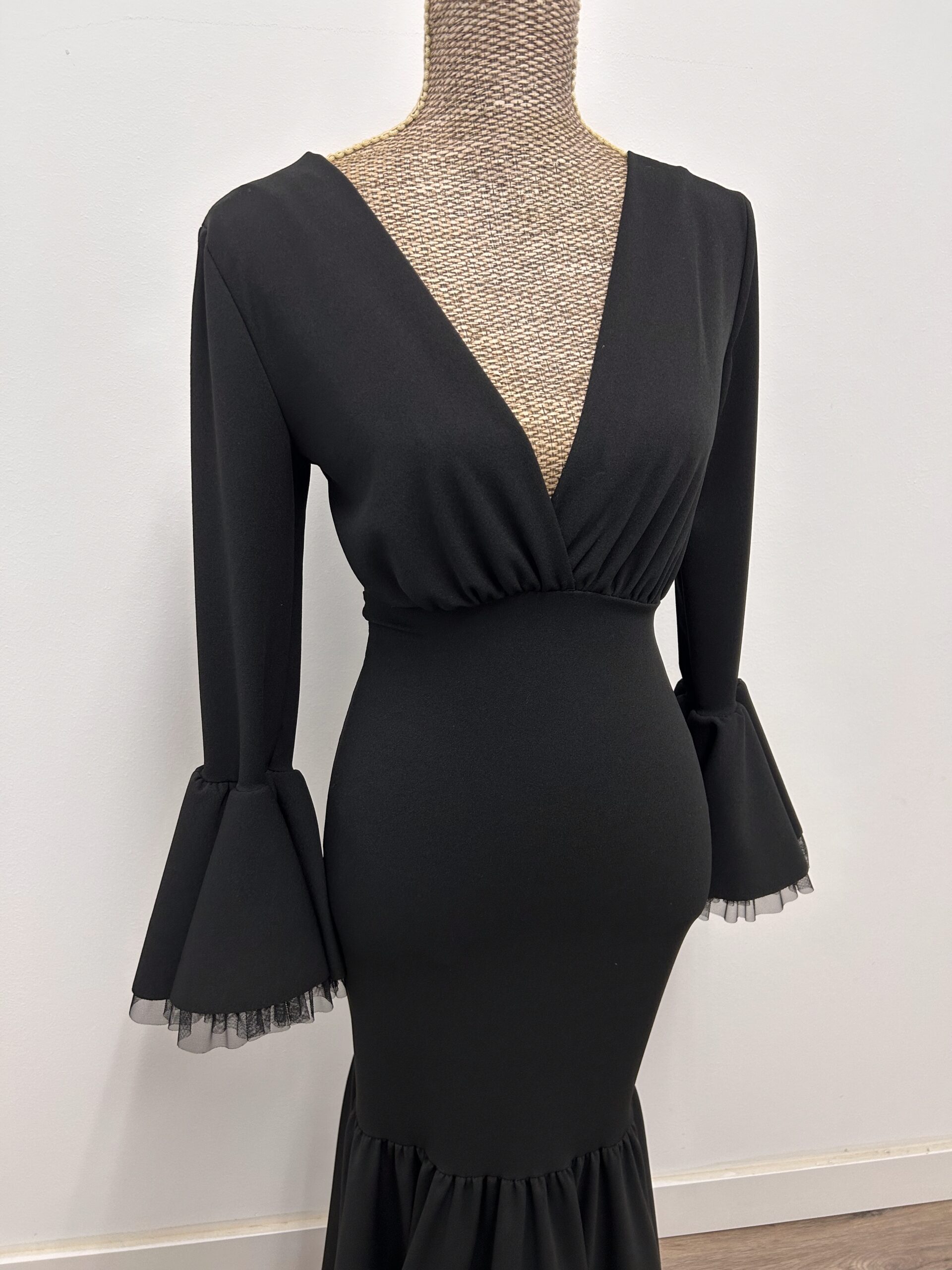 - Tejido de crepe elástico en color Negro ,lleva un buen escote por delante de 33 cm y por detrás de 28 cm.
