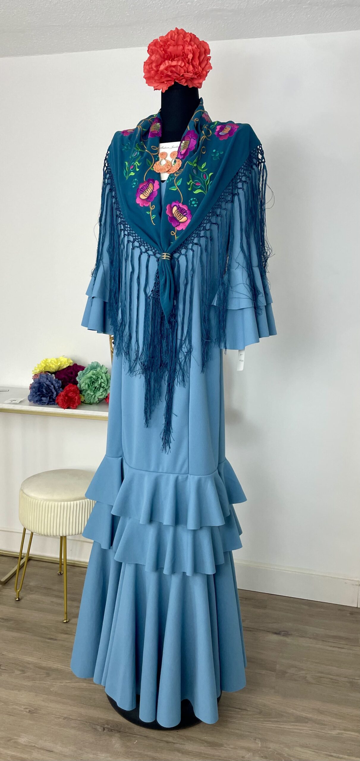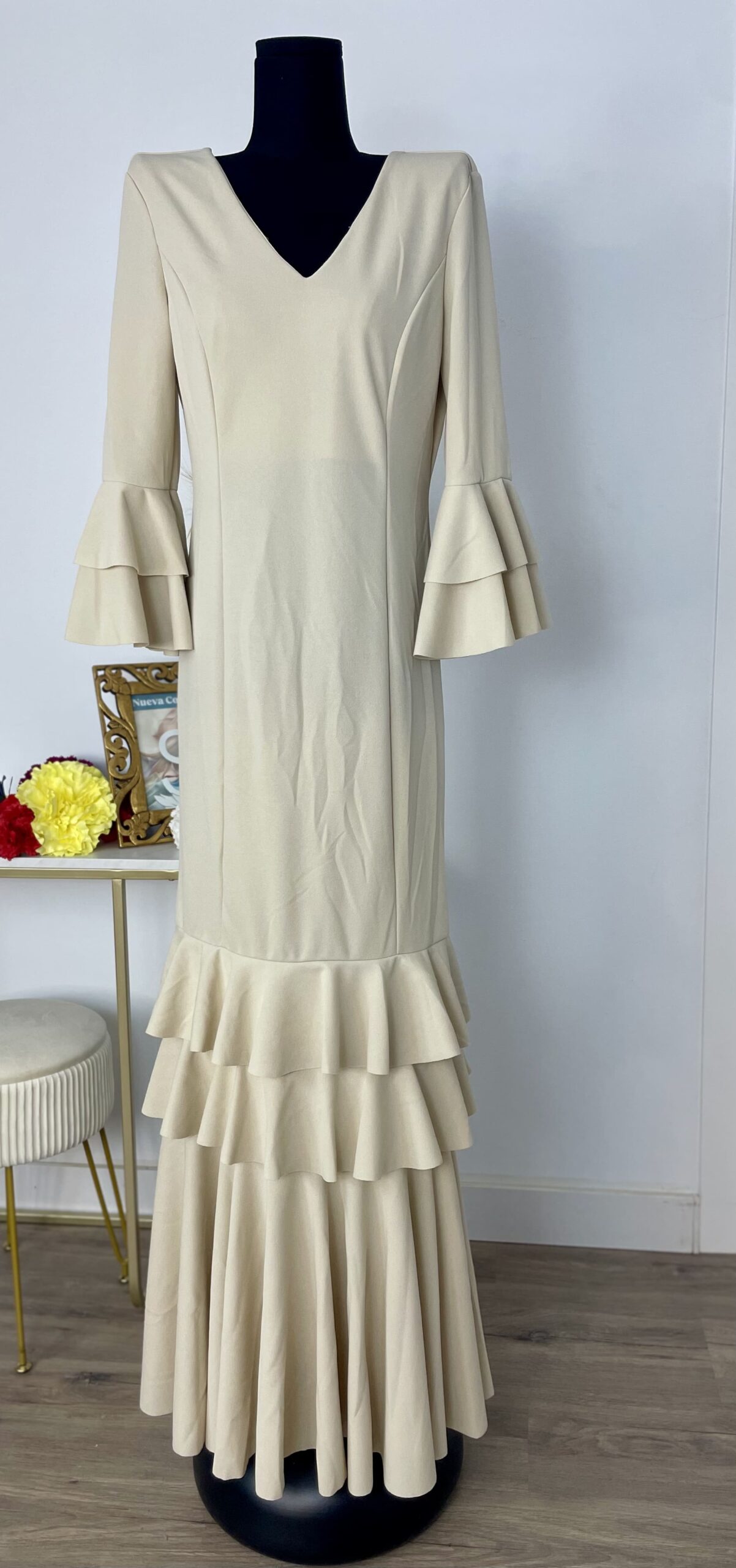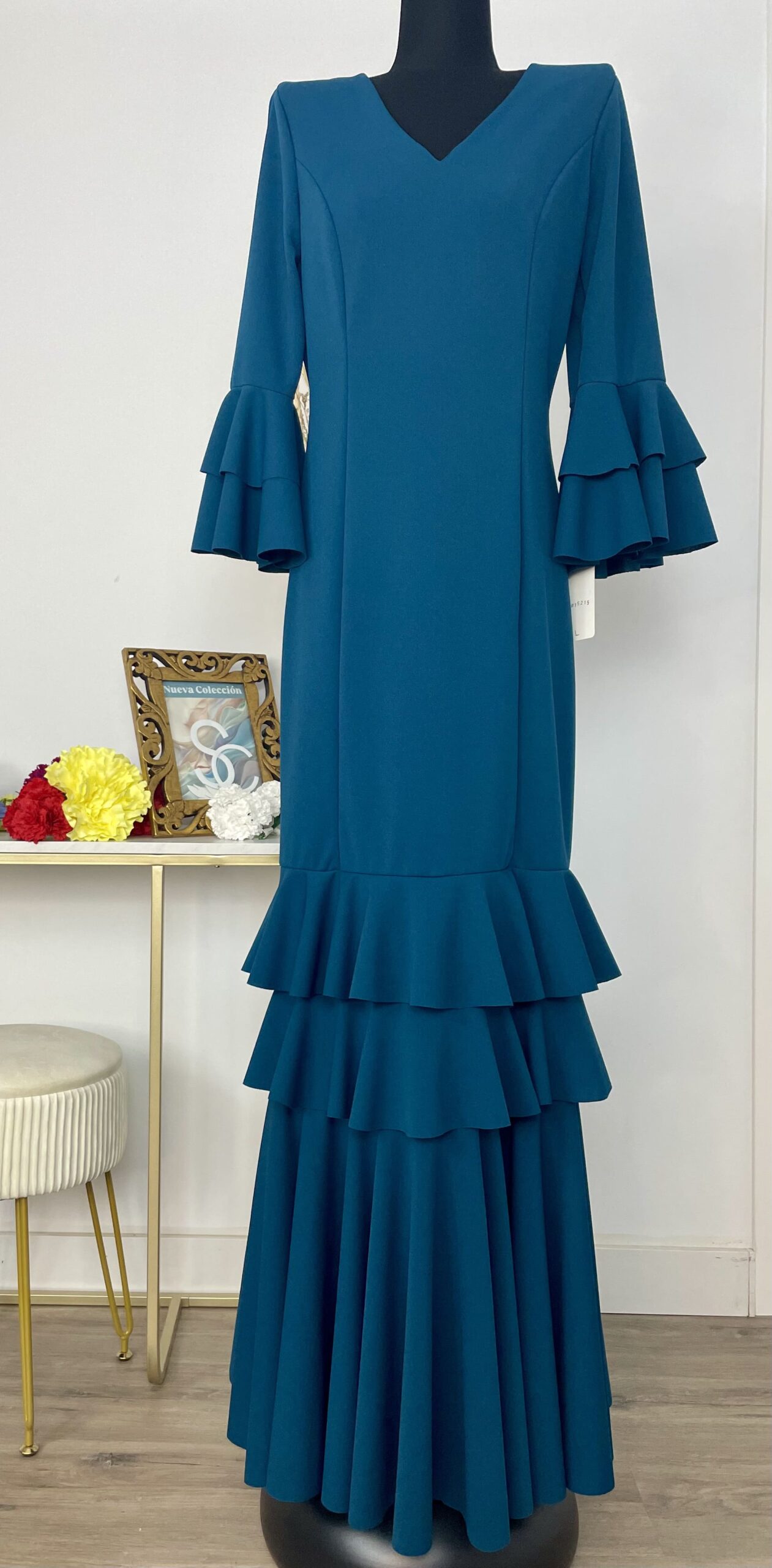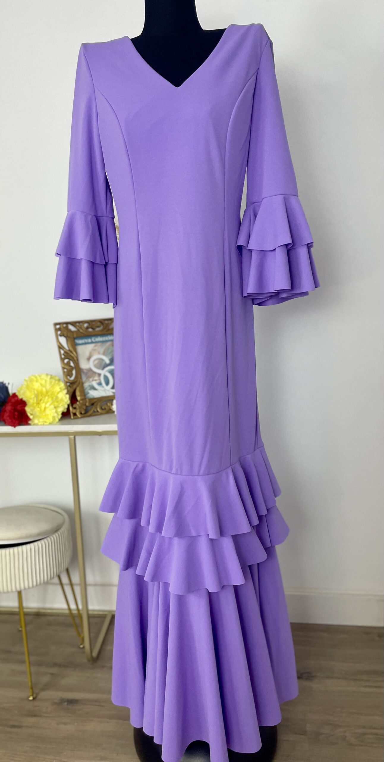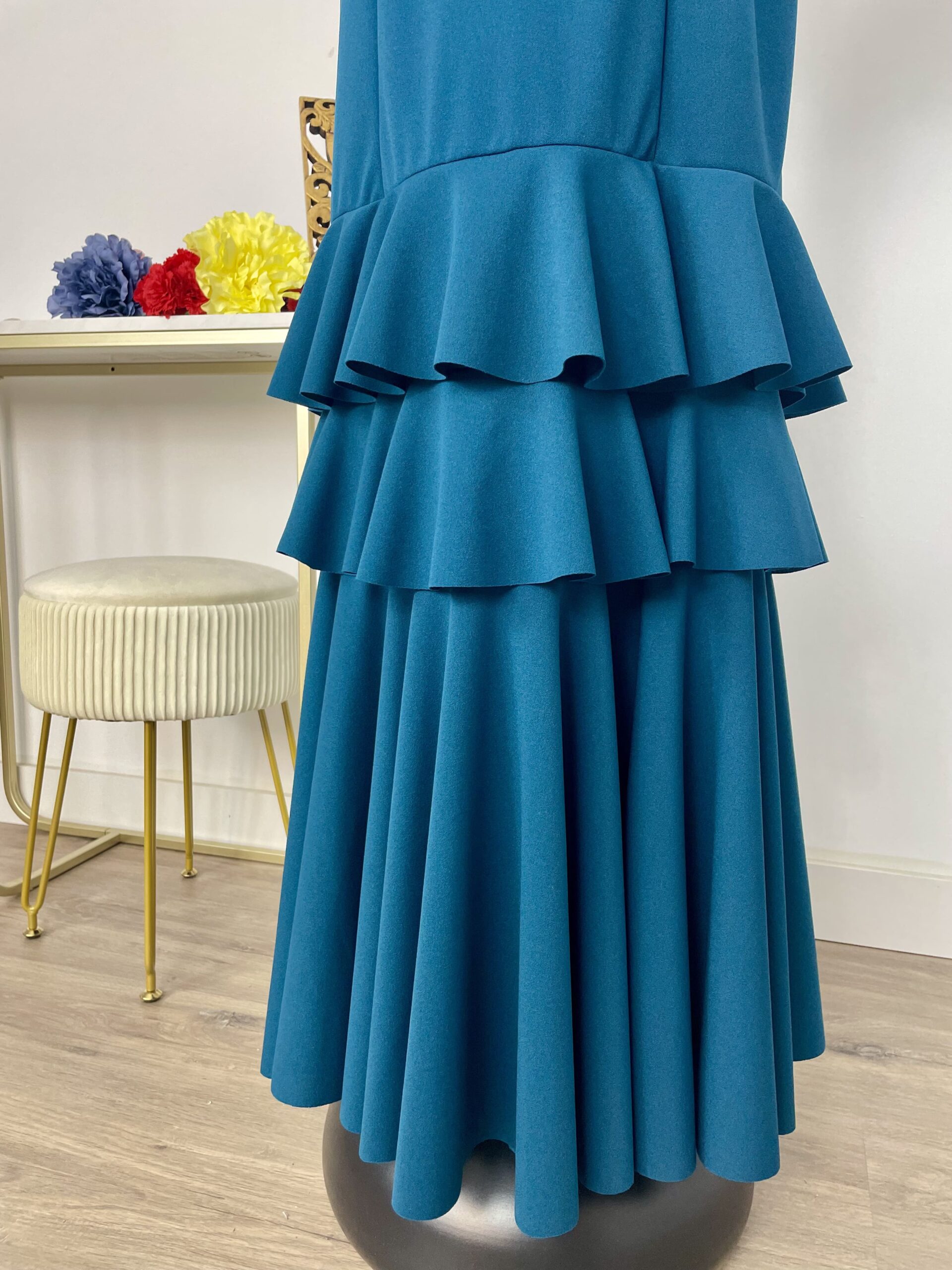 - Tejido de crepé elástico ,muy parecido al Modelo Rocío, la diferencia ,los volantes son dos pequeños y uno largo.