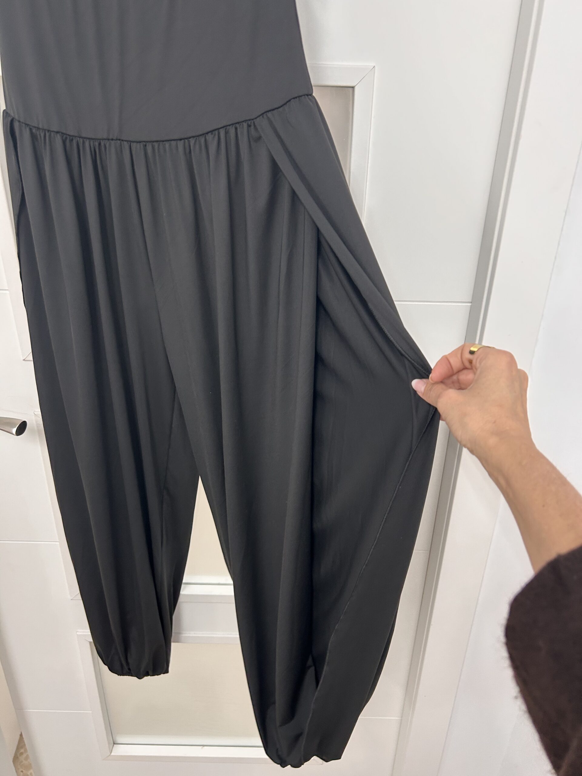 - Mono Negro fondo de armario ,con abertura lateral, gomilla en tobillo, escote en la espalda ,broche botón en el cuello.