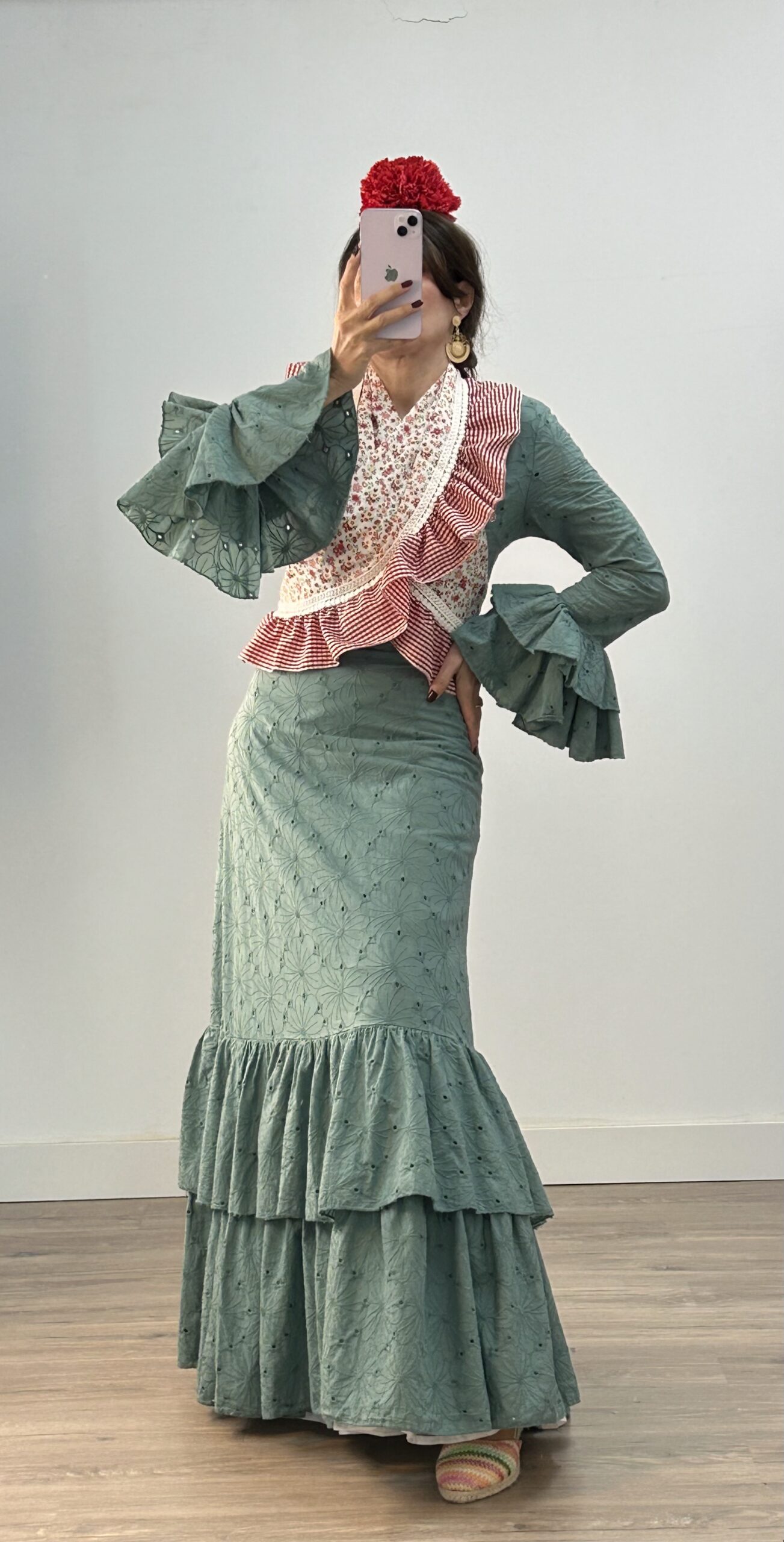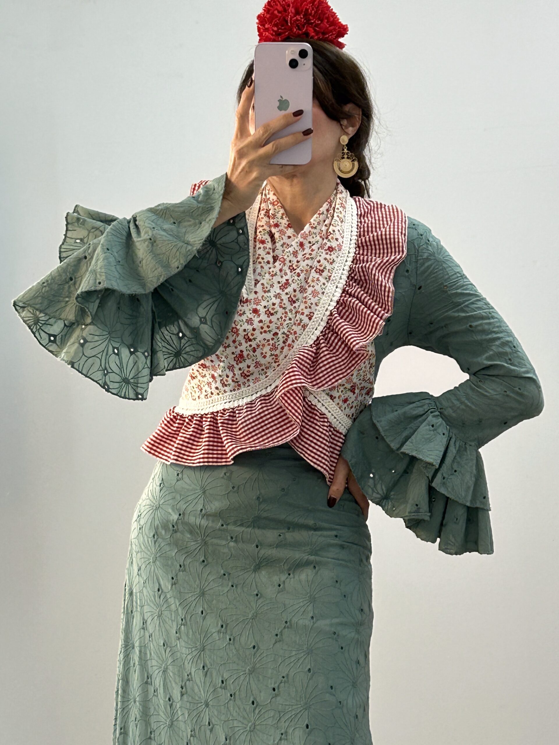 - Piquillo estampado de florecitas en tonos rojos beige y verdes, pasamanería color blanco ,volante vichy Rojo.